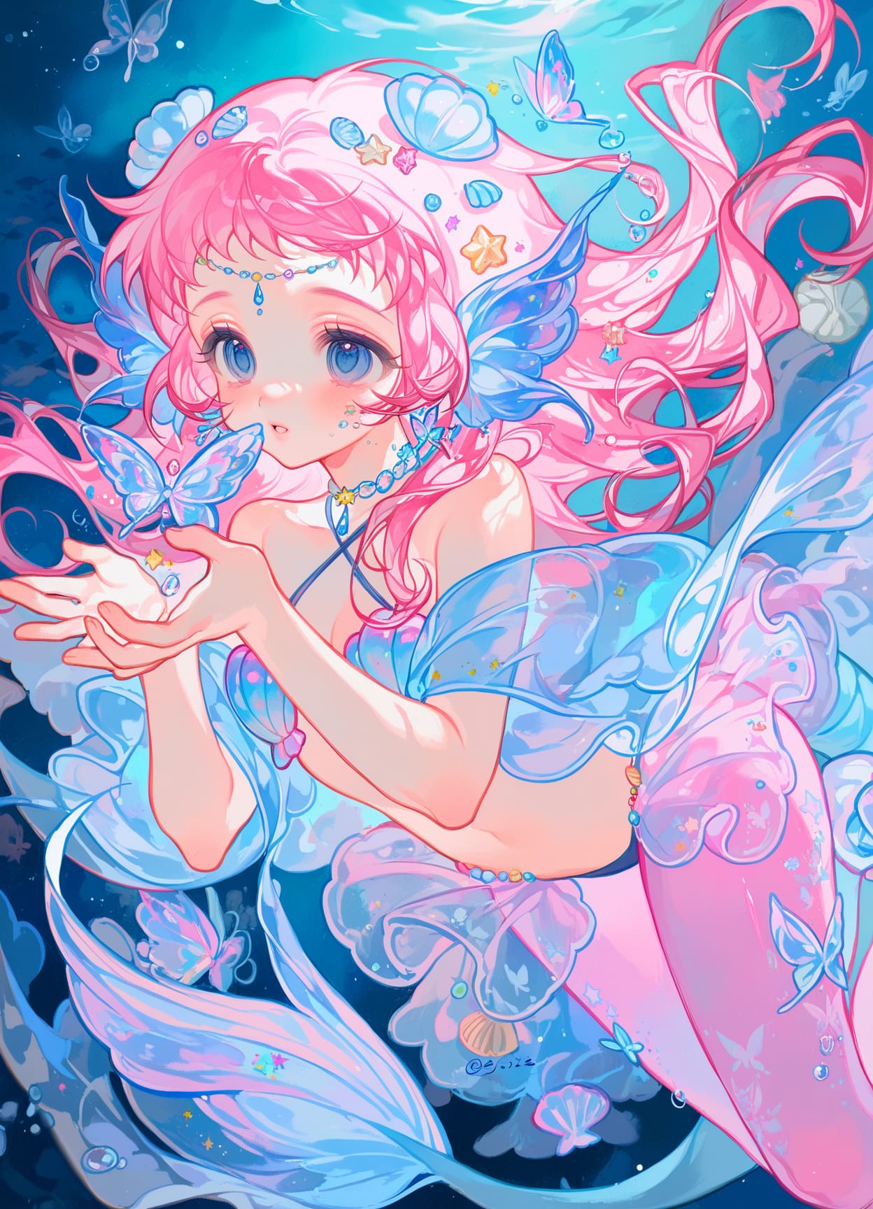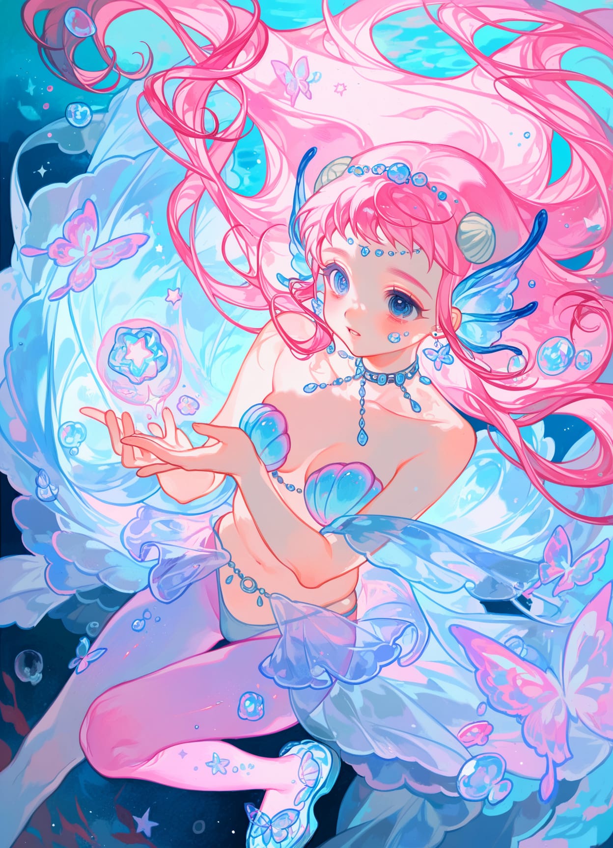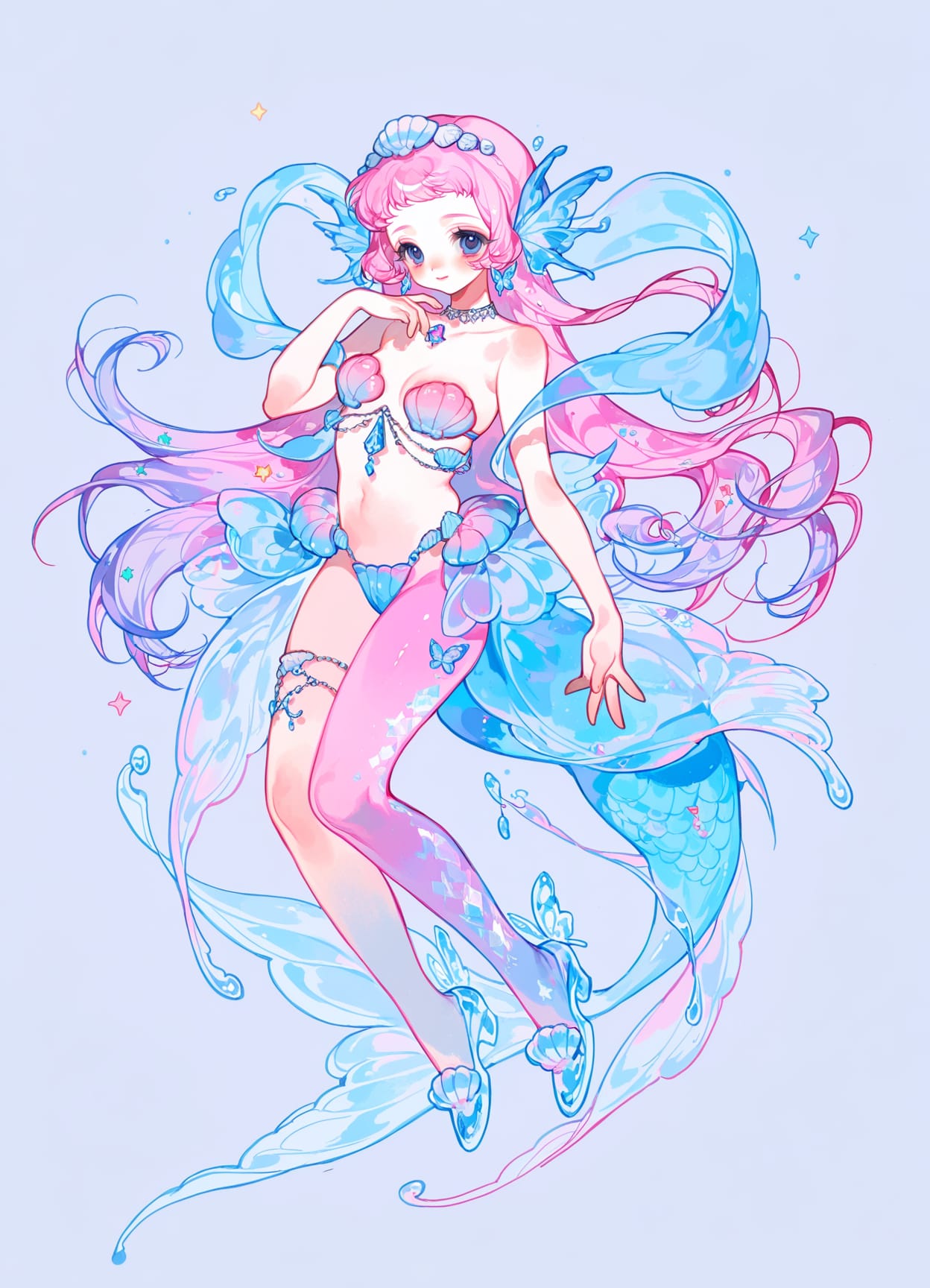 crystal fish tail,fish ears,fish fins,fish scales,circlet,(seashells in hair,stars in hair),sparkling choker with gems,butterfly earrings