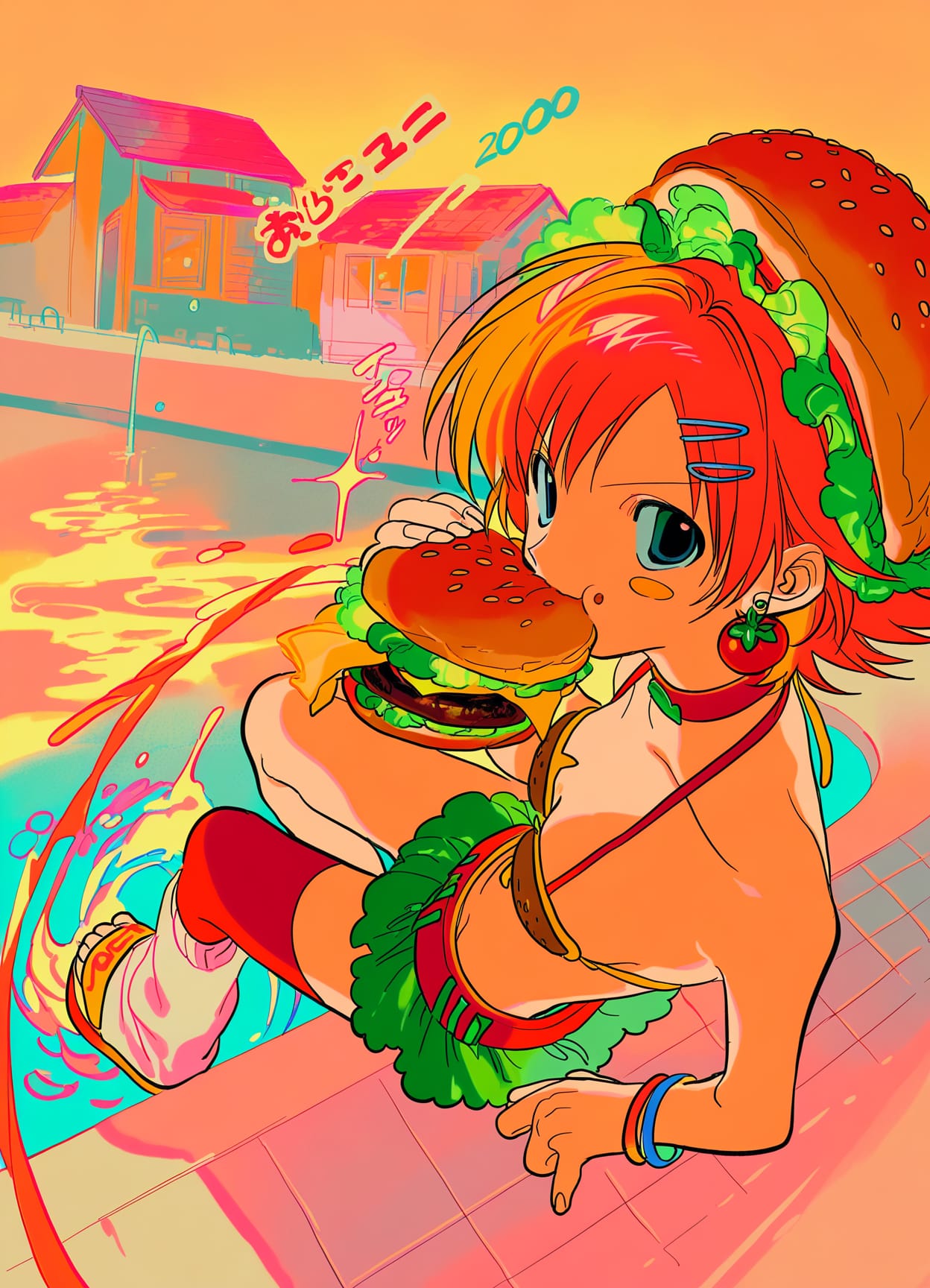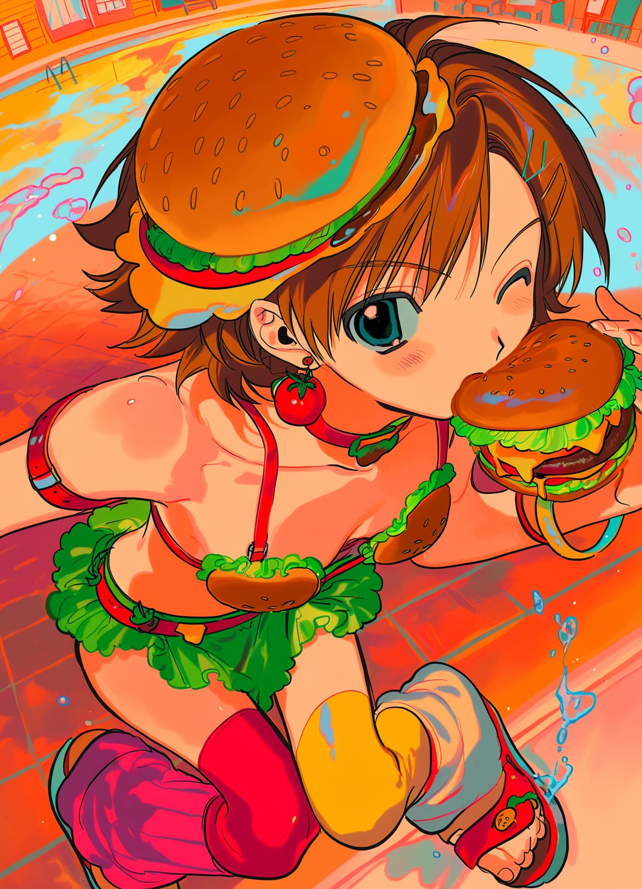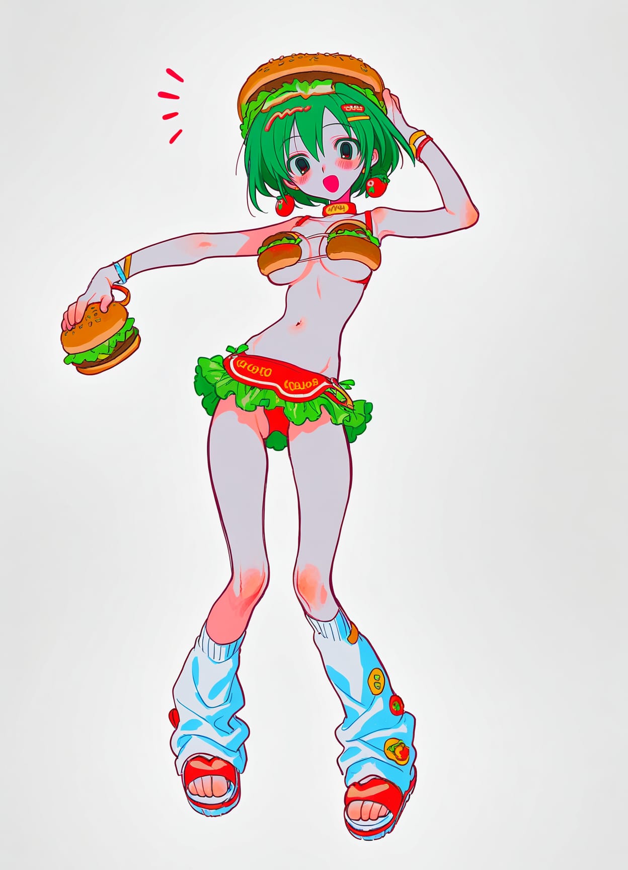 burger bikini,burger bra,burger keychains,burger sneakers,bikini skirt,lettuce skirt,burger charms,sandals,red burger sandals,lettuce belt,((red straps,yellow straps)),asymmetrical legwear,leg warmers,fingerless leg warmers,yellow stockings,red stockings