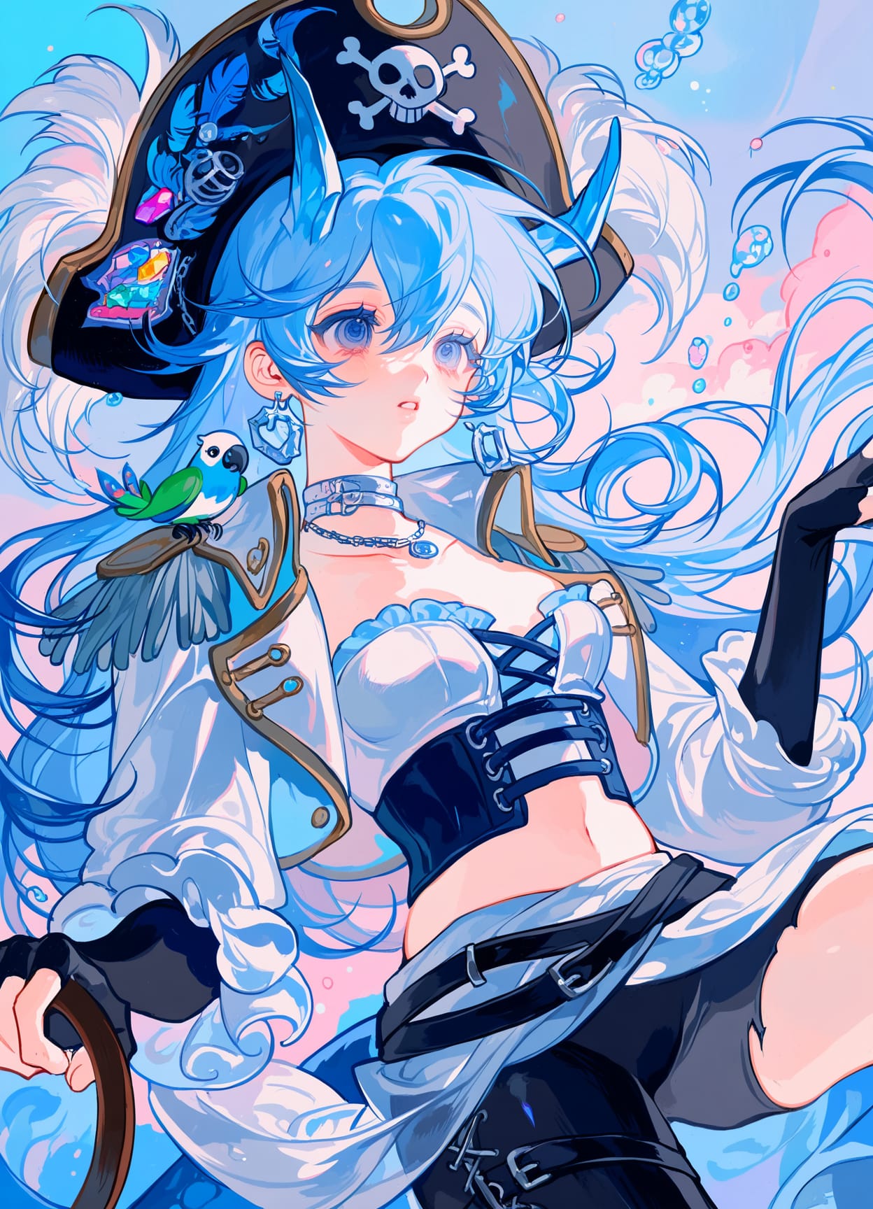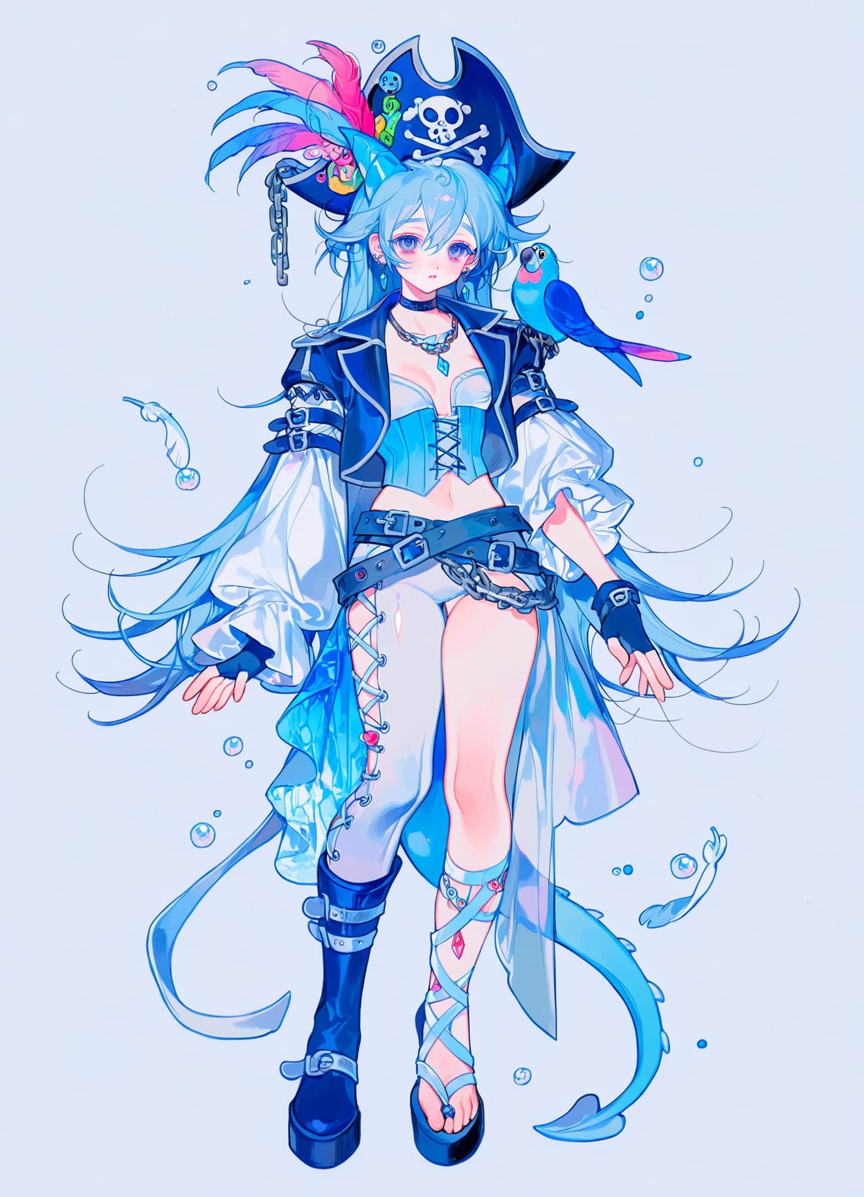 pirate hat,(many feathers on hat),silver trim,choker,necklace,blue parrot on shoulder,head collar,silver earrings