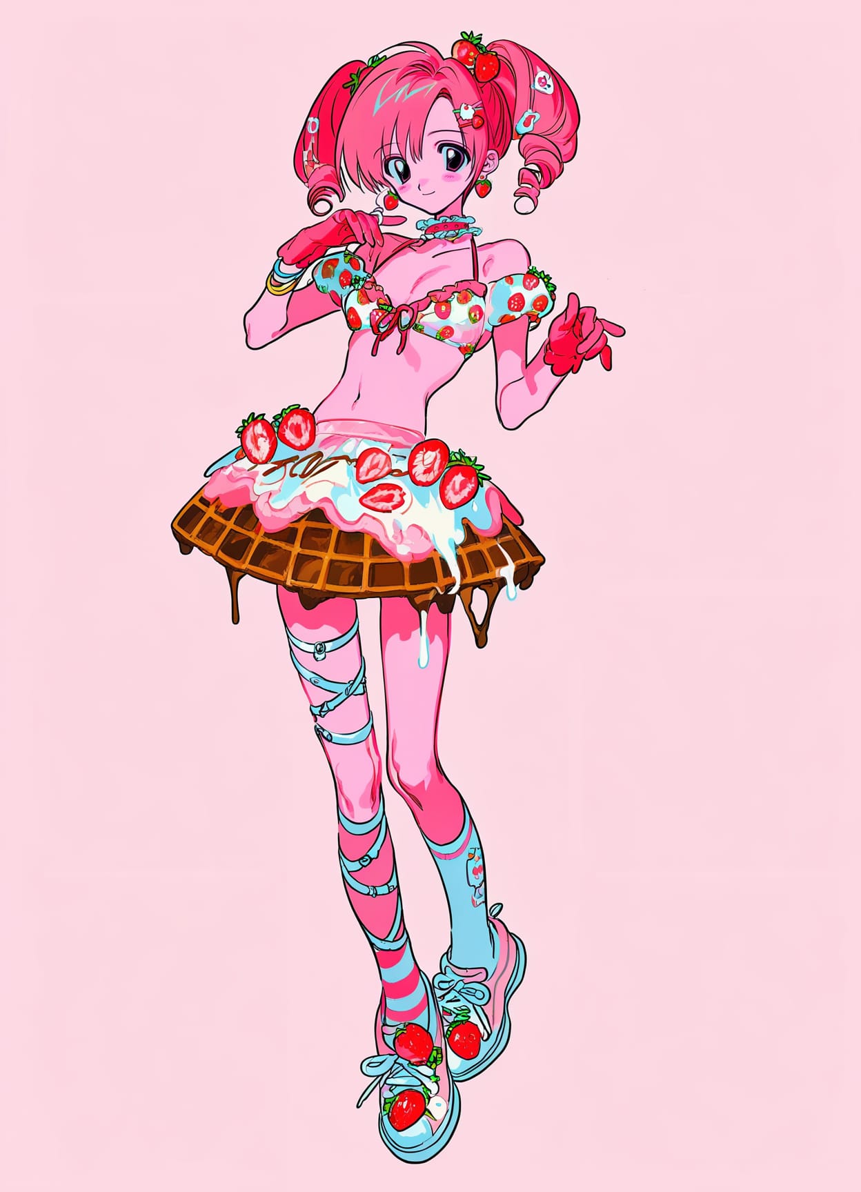 off-shoulder bikini,(milk print on bikini),bow on bikini,pink bikini,bikini skirt,(icing on skirt),strawberry on skirt, waffle dress,((waffle skirt)),ruffles on thighs,asymmetrical legwear,socks,(decora),lolita accessories,thin straps,v shaped neckline,food-themed clothes,(chocolate overskirt),layered showgirl skirt,((shoes,shoe glaze,strawberries on shoes))