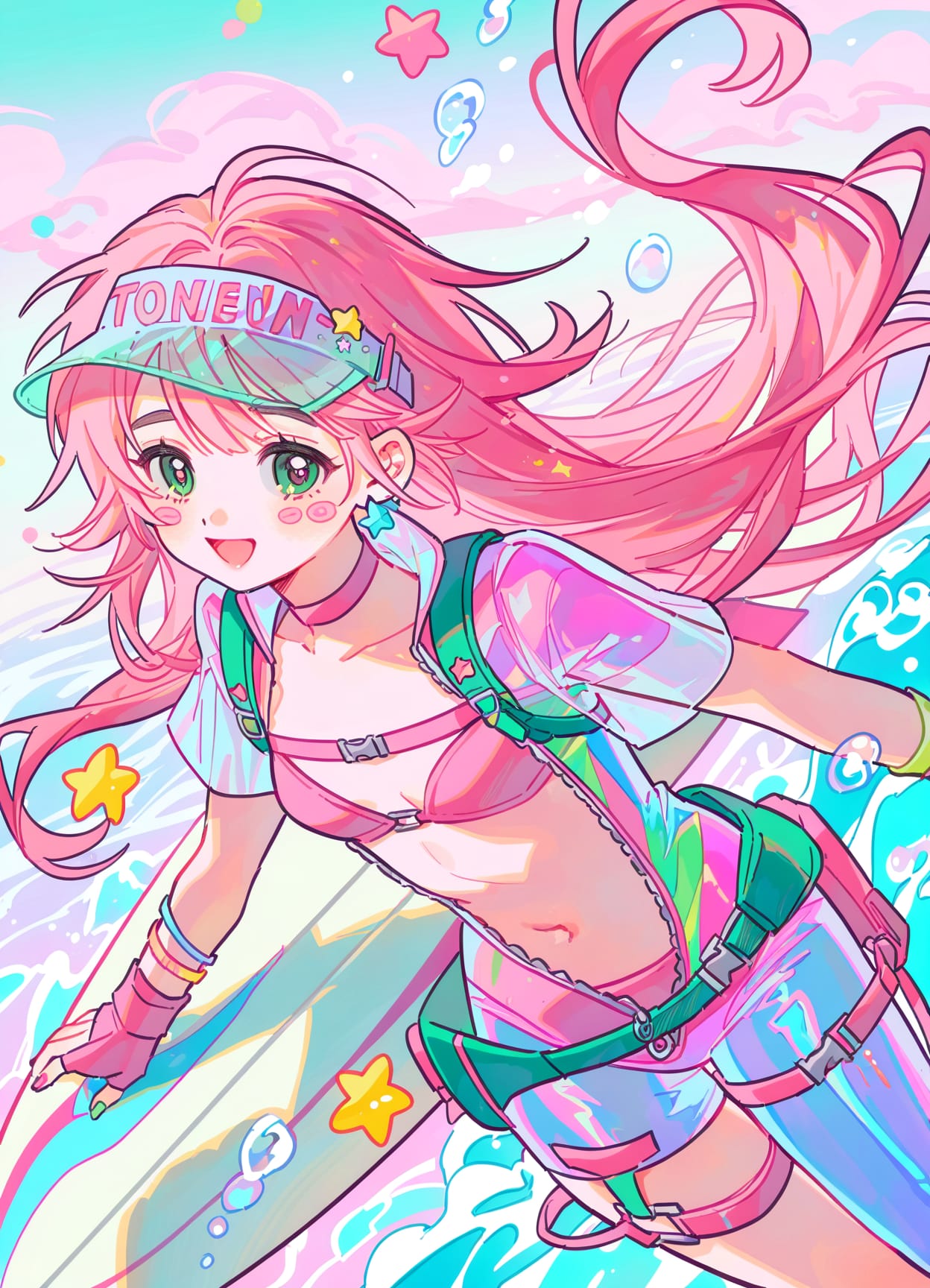 cyberpunk fashion surfing fashion,(colorful jumpsuit, many details),tight jumpsuit,((chest harness)),wetsuit,bodysuit,zipper,zipper pull tab,tight pants,covered legs,(text on clothing),(latex pants, tight pants),tight sleeves,(bare chest, bikini),navel,asymmetrical legwear,belt on leg,glowing sports sandals,bare toenails,short sleeves,belt on leg,japanese text print,single jumpsuit leg,pink clothes,gradient clothes,green clothes