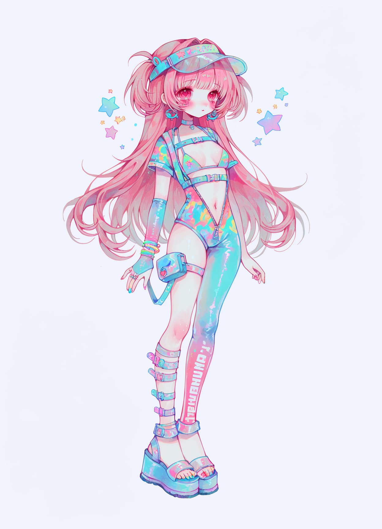 asymmetrical clothes,((blue one-piece swimsuit:1.5)),short blue top,bare stomach,single-shoulder one-piece swimsuit,multicolored bikini,pink straps,navel,high hips,bikini skirt,belt,belt buckle,(harness)rainbow print on skirt,bikini skirt,layered skirt,thong,pink ropes on stomach,belt on hip,toy keychains,(asymmetrical legwear),leg warmers,platform footwear, sandals,rainbow thighhighs,(belt on leg)