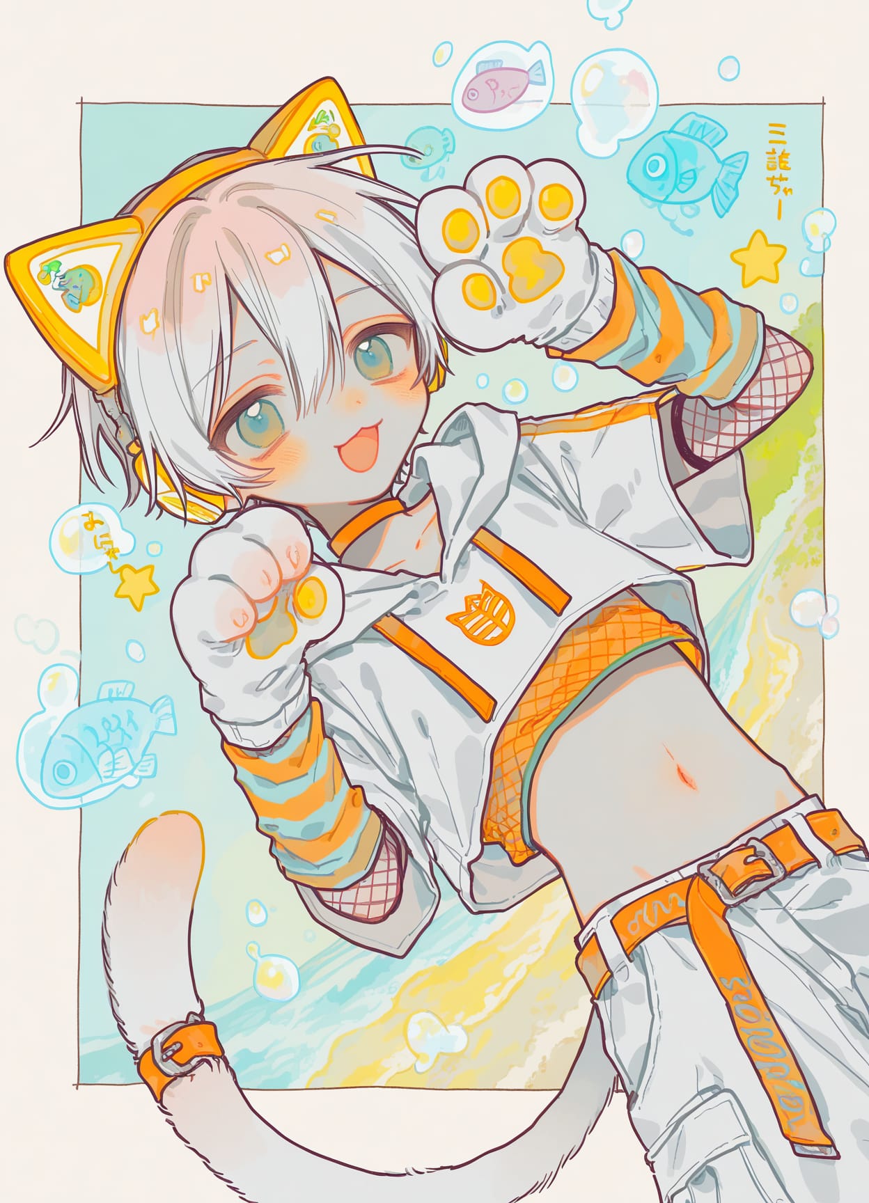 choker,fingerless gloves,(tight arm warmers),cat ears,artificial ears,tail belt