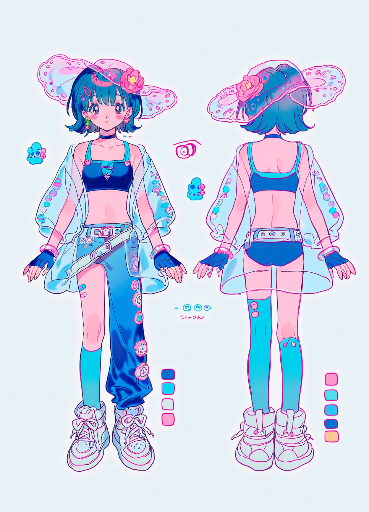(everyday fashion:1.1),(chest harness),((see-through top)),blue bikini,(blue bra),tank top,crop top,midriff,open shoulders,big see-through jacket,jacket collar,drawstring,belt,(belts),(blue pants, single pants leg),asymmetrical legwear,blue thighhighs,tight belt on leg,short shirt,((pants one leg)),keychains pink flowers,high tops sneakers