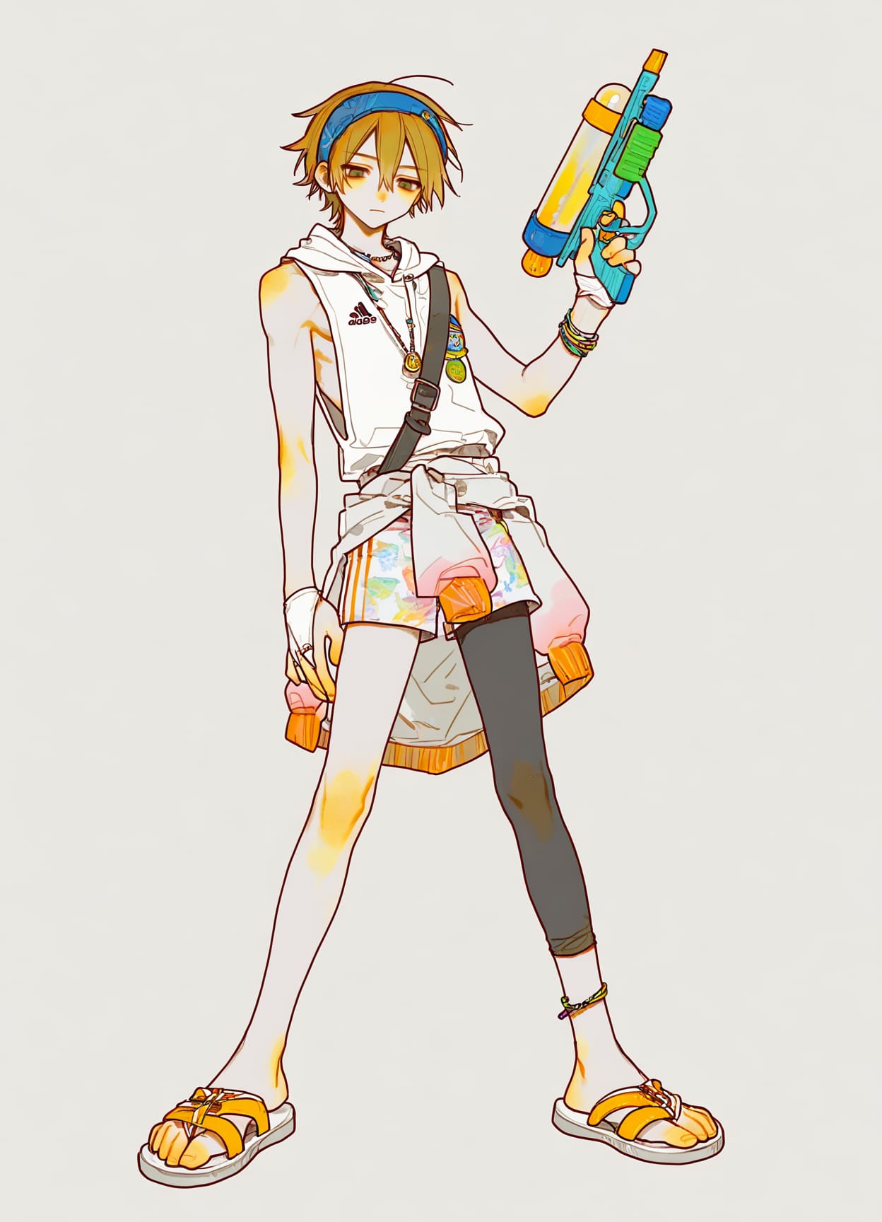 hood,hoodie, jacket,sleeveless hoodie,white hoodie,shorts,adidas print shorts,jacket around waist,bridal gauntlets,leggings under shorts,yoga pants,sleeveless sweater,orange clothes,sam browne belt,cuff links,suspenders,badges, keychains,flip-flops,sandals