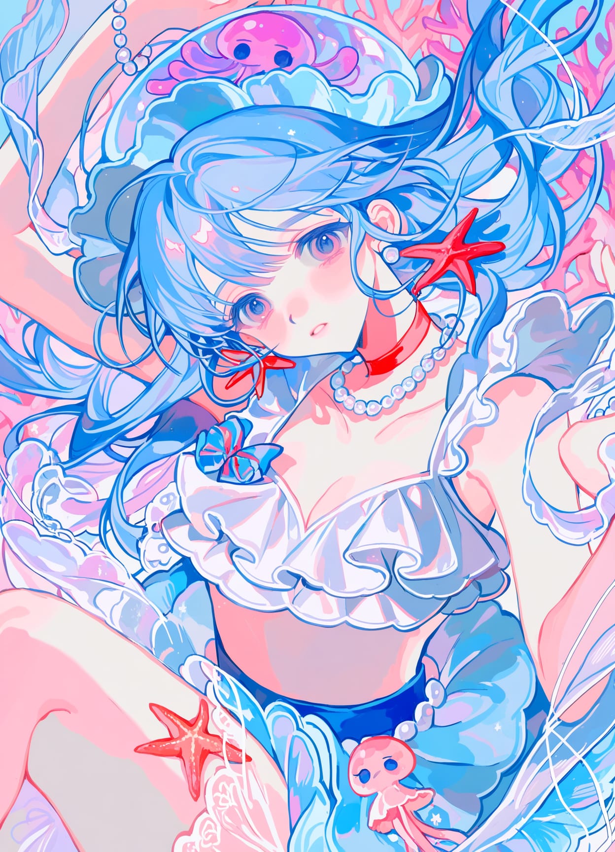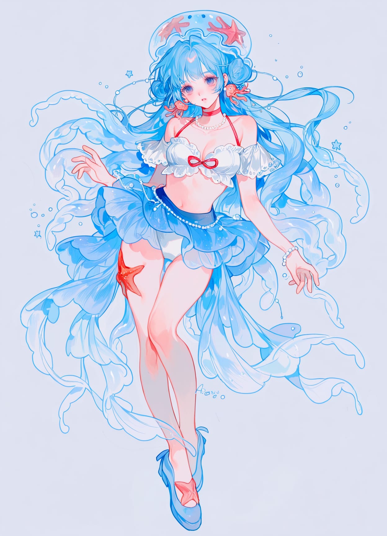 white bikini,bikini ruffles,red choker,white lace top,cleavage,short skirt,tight skirt,jellyfish skirt,dancer skirt,transparent strings on skirt,blue skirt,long back,jellyfish tentacles,coral belt,bow on chest,ruffles on leg,shoes,pearl sole,(large platform)