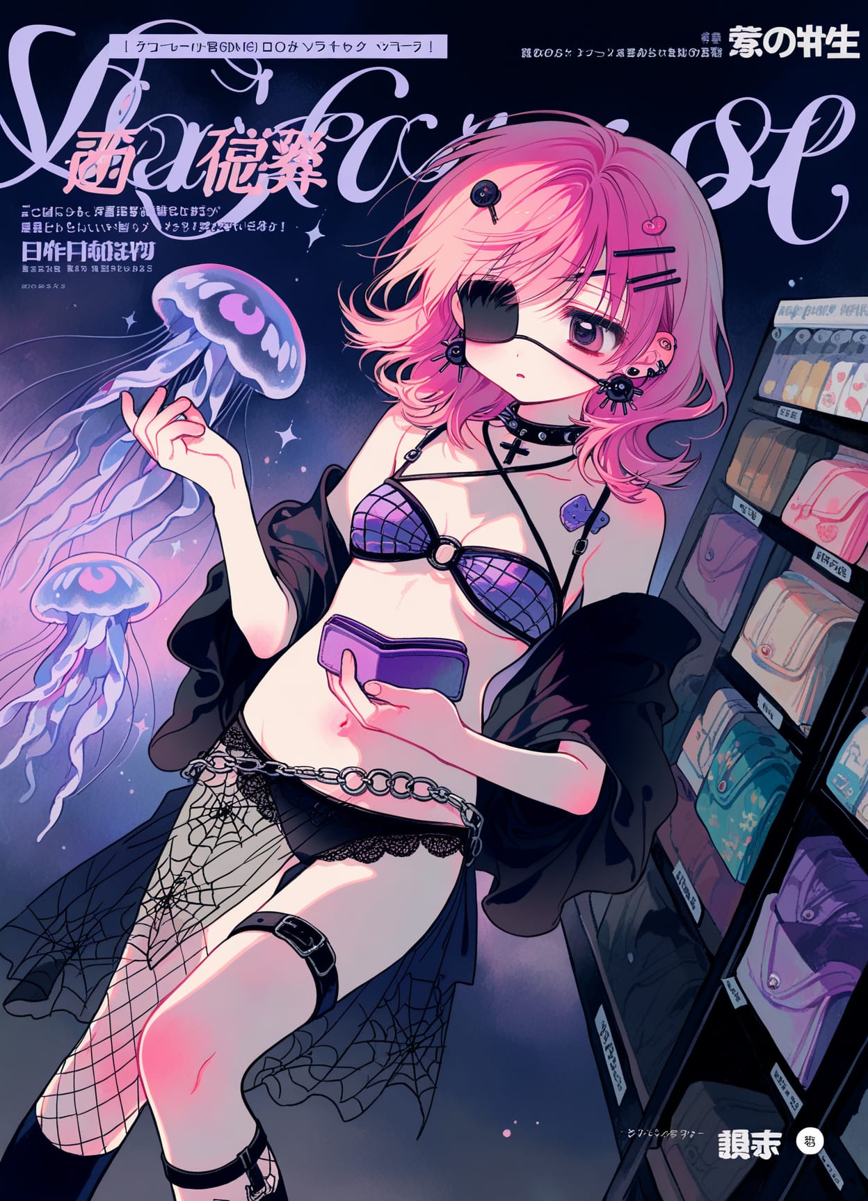 piercing,cross on choker,spiked choker,(belly chain, wallet chain:1.3),((black jellyfish earrings, black pearls)),hairpins,((gothic decora))