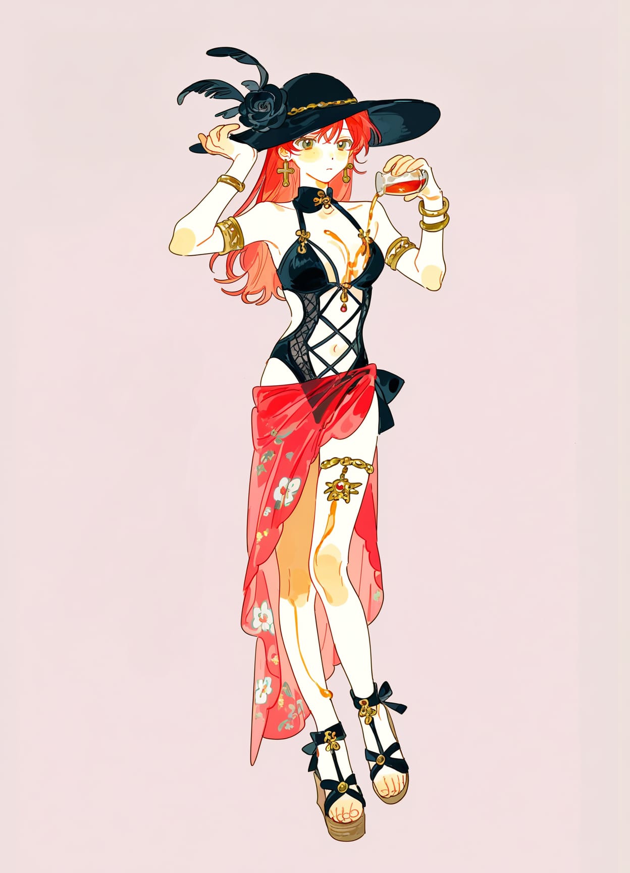 bare shoulders,black one-piece swimsuitbracelet, cleavage, clothing cutout,navel,gothic fashion, red ruby on chest, bow on sarong, gothic fashion, cross-lace swimsuit, cross-lace shoes, golden chains on sarong, golden jewelry on shoulders,red inner side of sarong,very long sarong,high heels,sandals,toeless footwear,toenails,wedge heels