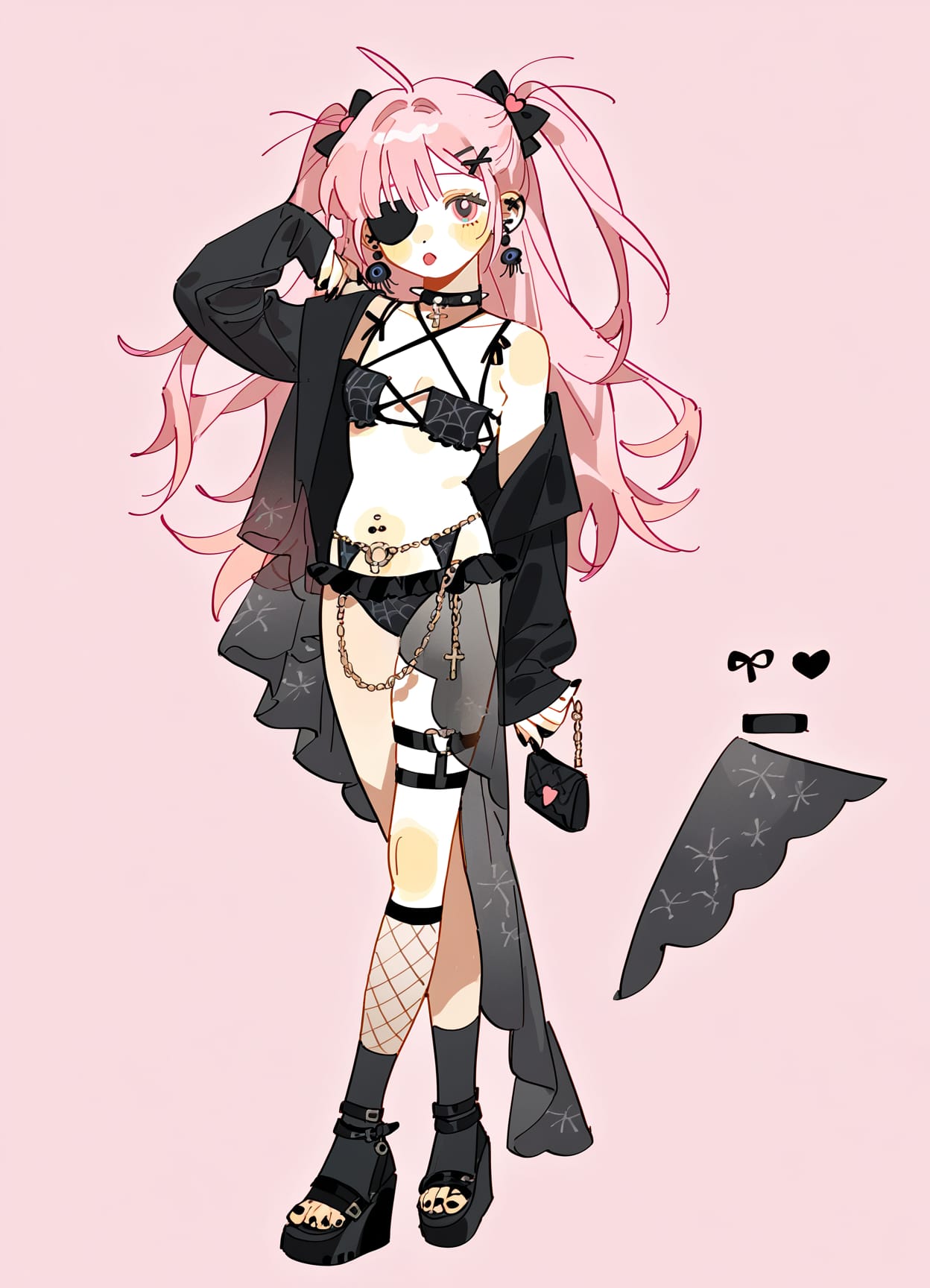 (gothic fashion, punk fashion:1.1),o-ring top,eyepatch bikini,criss-cross halter,((black swimsuit)),chest harness,lace-trimmed panties,lace bra,(see-through sarong),spiderweb print,see-through shawl,((black shawl)),cross-laced bikini,fishnet swimsuit,traps on legs,thigh strap,garter belt,asymmetrical legwear,black socks,open toes,black nails,wedge heels