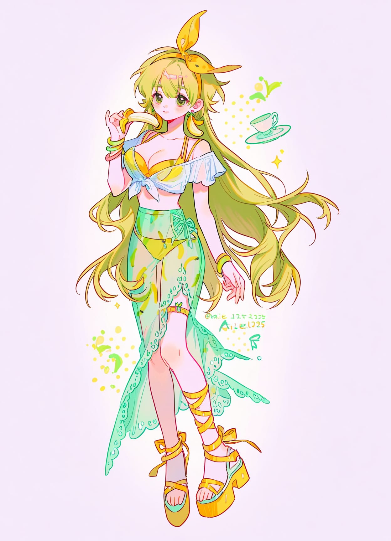 fruit,hairband,jewelry,banana earrings, banana bracelets,yellow bikini,multi-strapped bikini top,tied shirt,short sleeves,short shirt,open shoulders,bare breasts, cleavage,dress ruffles, lace dress,dress narrowing,(see-through dress:1.3),yellow ribbons on legs,very long skirt,ruffled skirt,tied skirt,midriff,banana print skirt,cross lace-up, thigh straps,yellow ribbons on legs,platform shoes