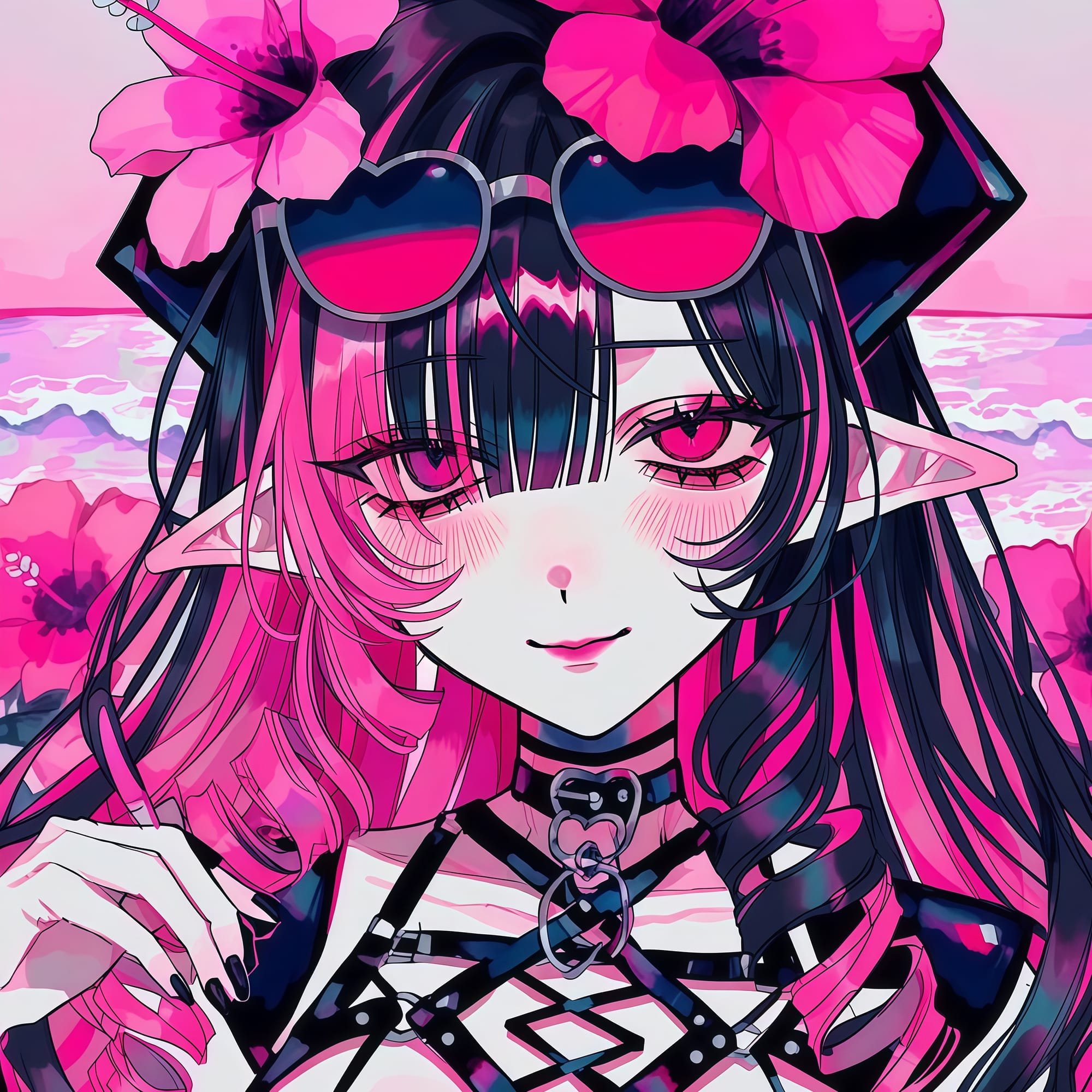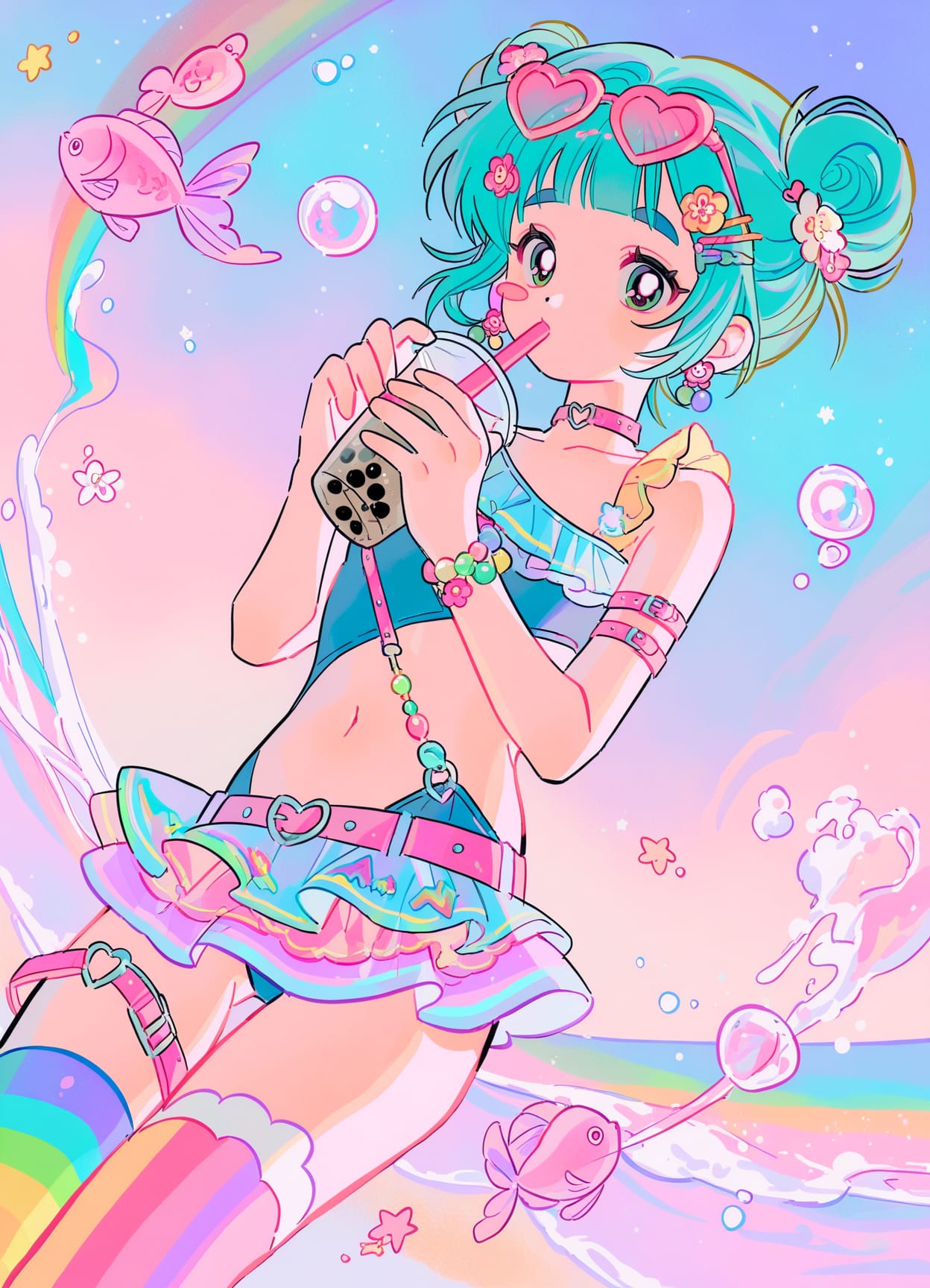 hair ornament,(hairclip),((flowers decora)),eyewear on head,heart-shaped eyewear,more bead bracelet,rubber beads,choker,colorful earrings
