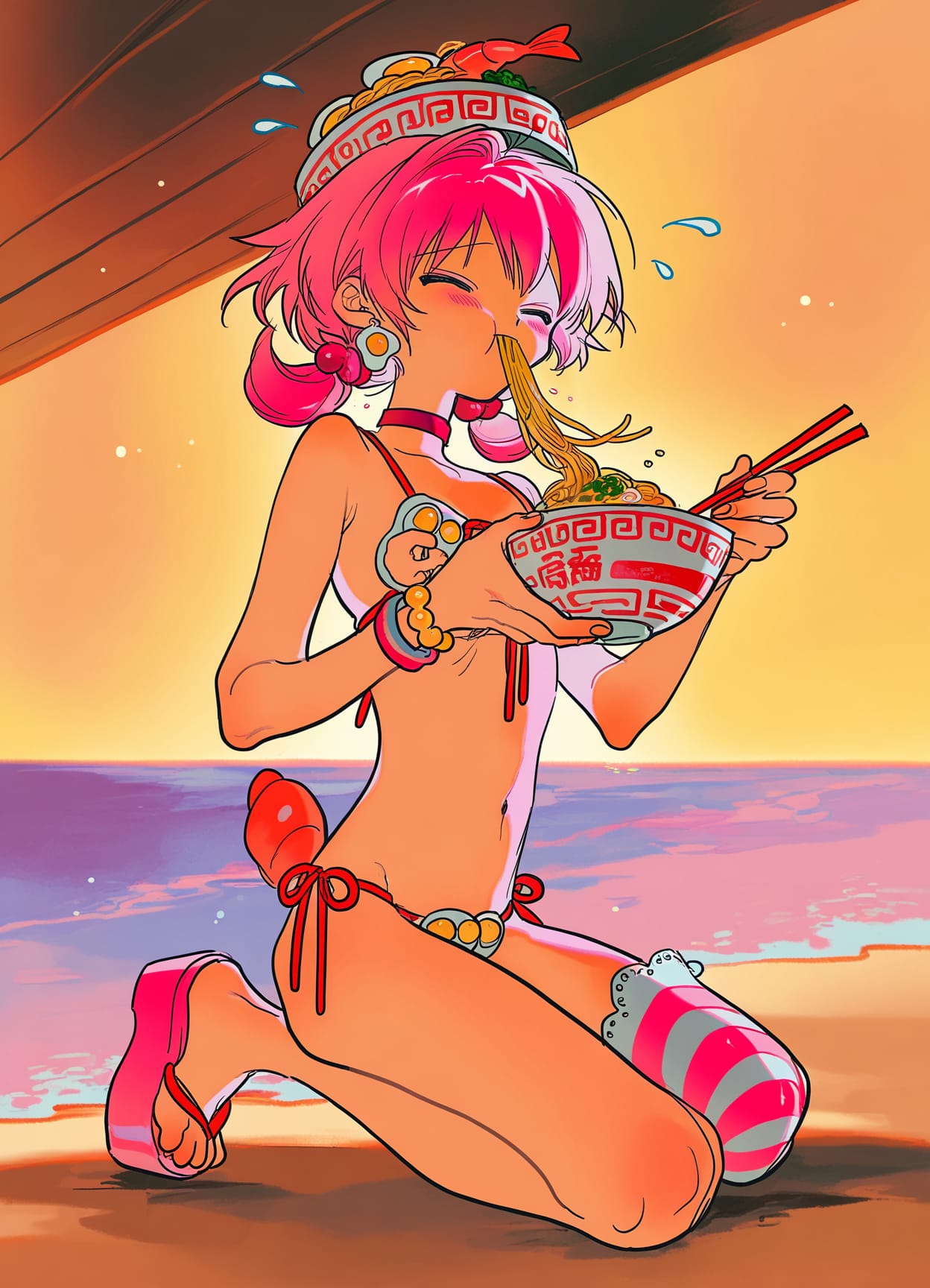 shrimp tail,shrimp ears,bracelet,choker,jewelry,food-themed earrings,(fish roe bracelet),noodles on hair,striped bracelets,(bowl of ramen on head, bowl on head:1.3),((egg earrings))