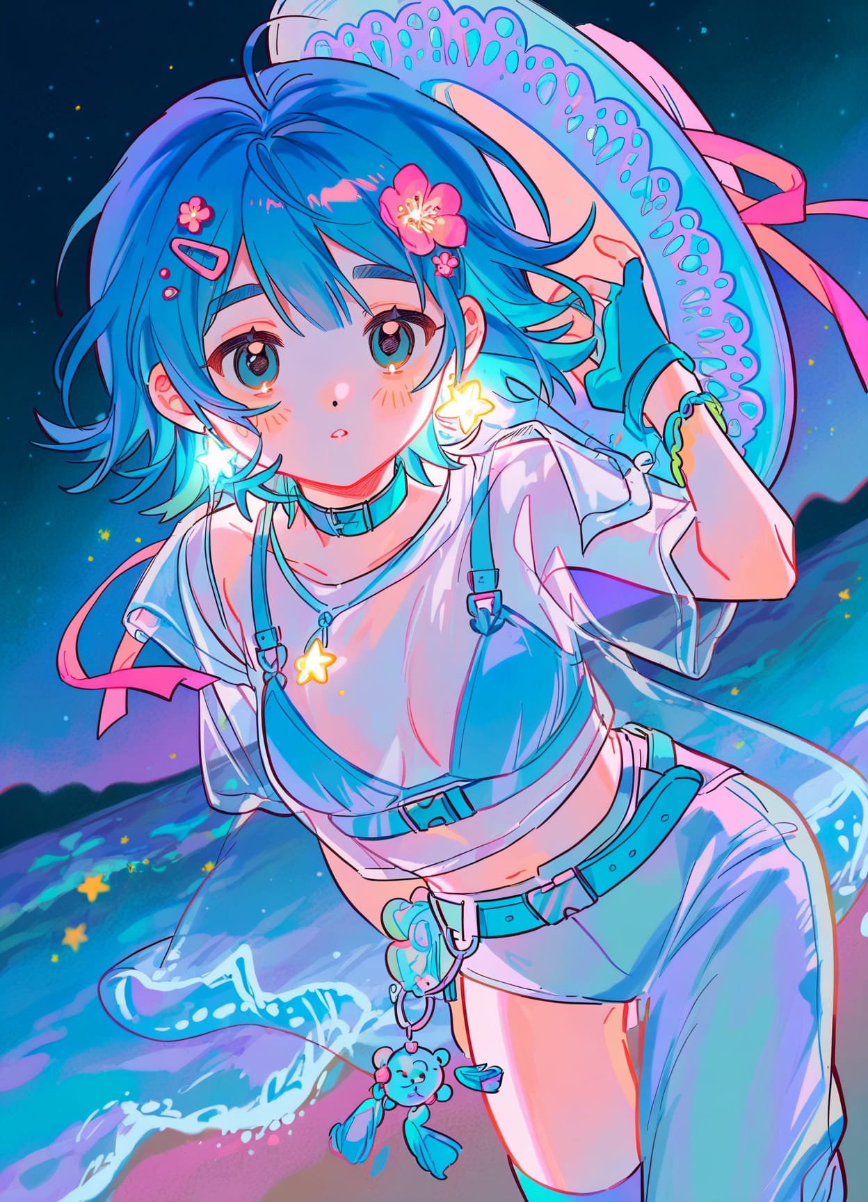 see-through shampoo hat,(hairclip),choker,colorful earrings,hair ornament,hair flower,blue fingerless gloves,bracelet,jewelry,(water decora)