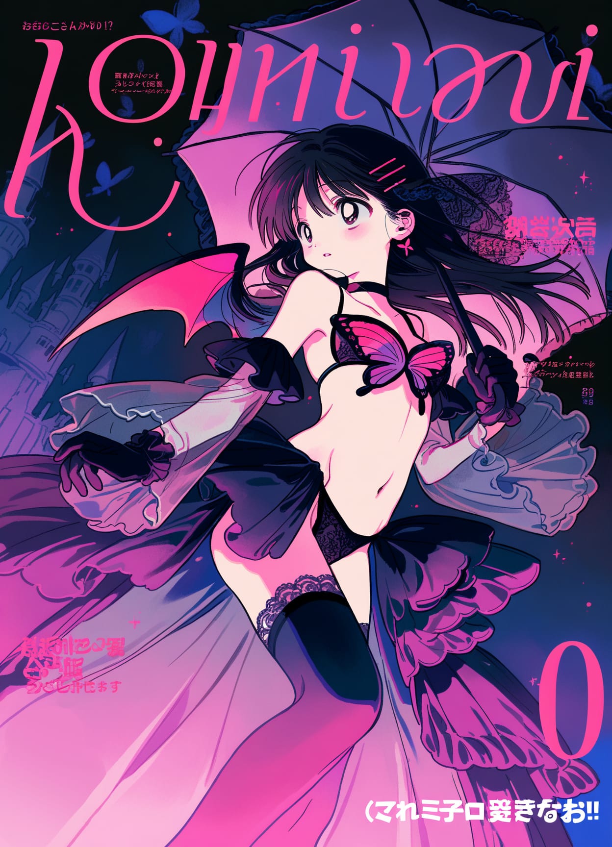 holding gothic umbrella,black rose earrings,lace veil,choker,demon wing,ruffled gloves