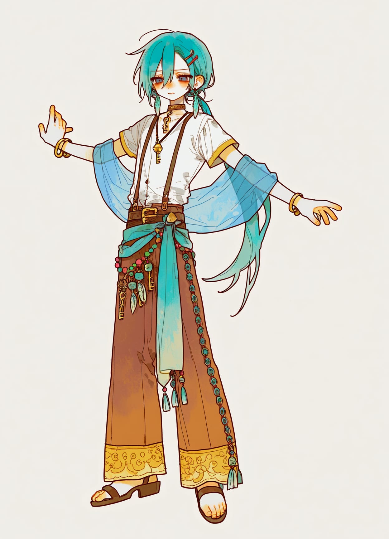 (indian clothes, arabian clothe:1.1),((white shirt)),short sleeves,baggy shirt,unbuttoned shirt,belt,sash,(long blue shawl),tassel,golden waist chain,brown pants,((bell-bottoms)),suspenders,high heels,sandals