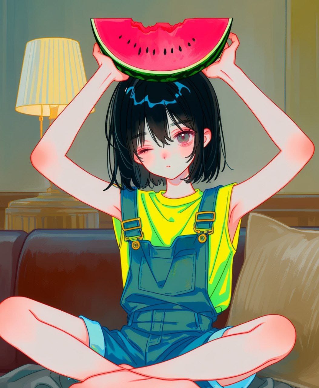 arms up, holding watermelon, holding with both hands, indian style, looking at viewer, object on head, watermelon on head, on couch, one eye closed, solo