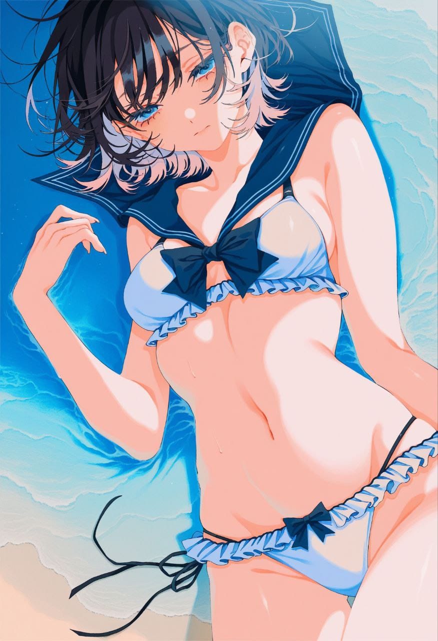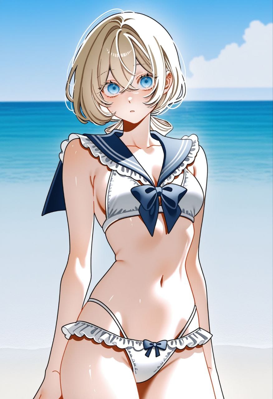blue sailor collar, bow, bra, frilled panties, frills, lingerie, panties, sailor bikini, sailor collar, swimsuit, underwear, underwear only, white bikini, white bra, string panties