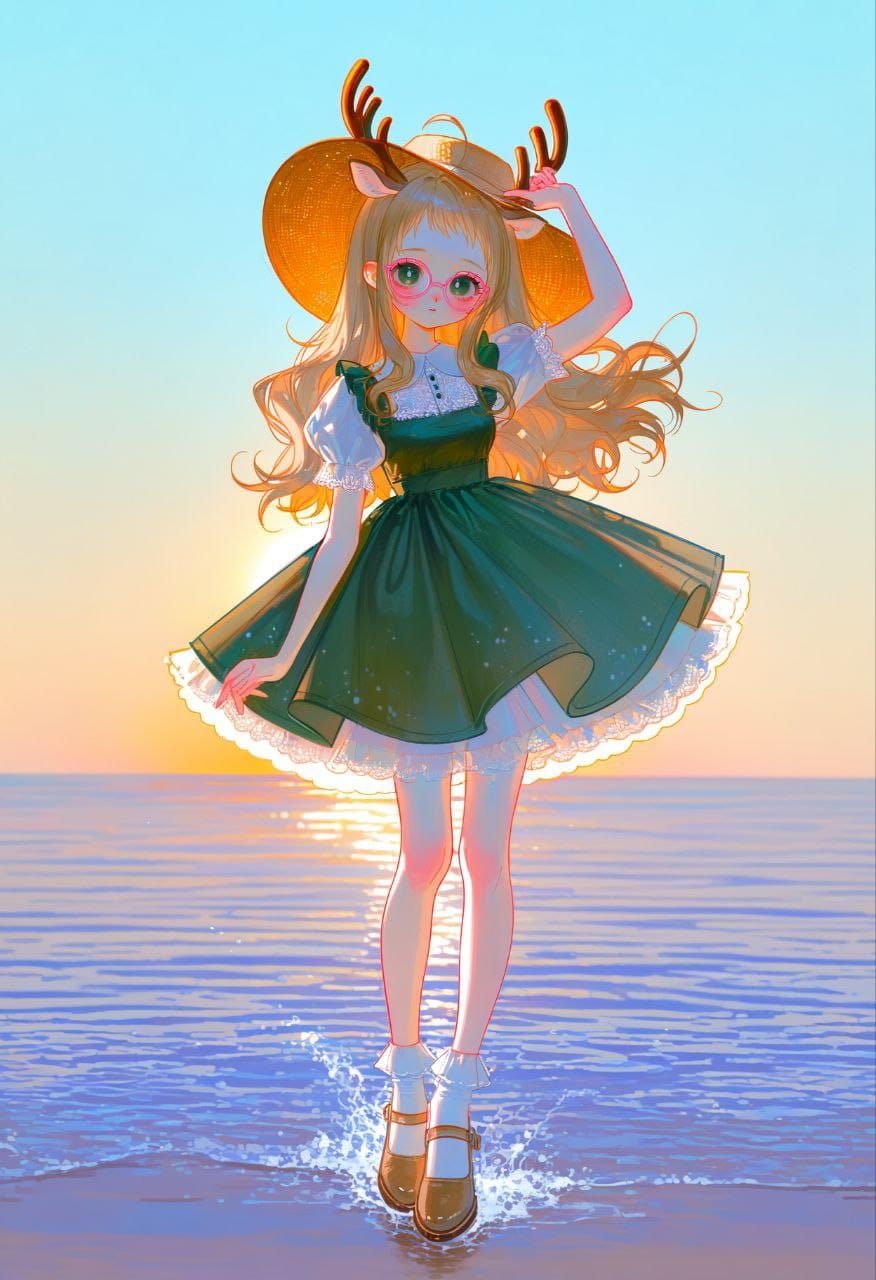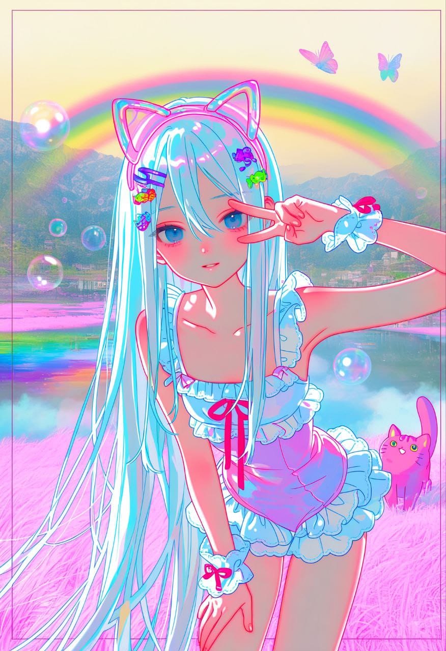 cowboy shot, hand on own thigh, leaning forward, looking at viewer, light smile, standing, v over eye