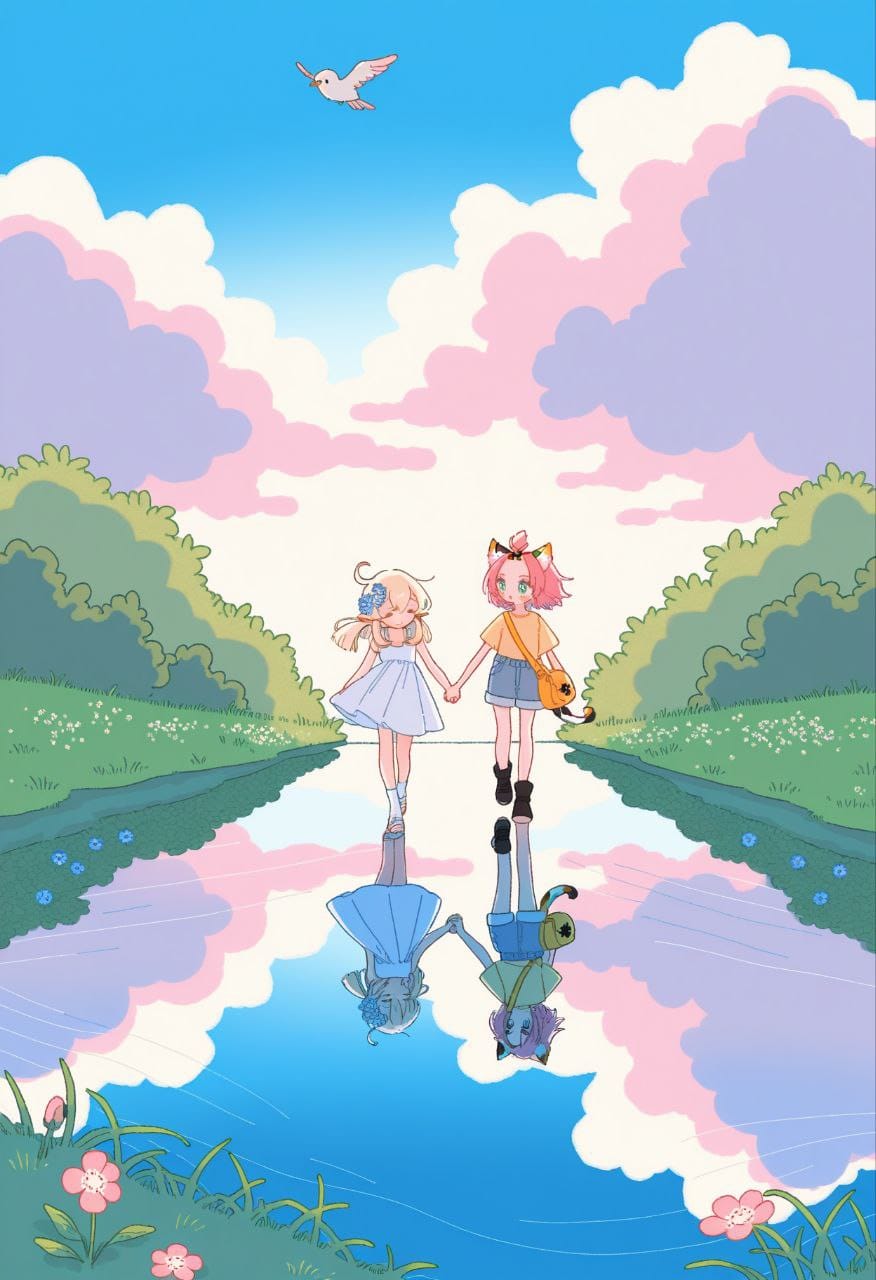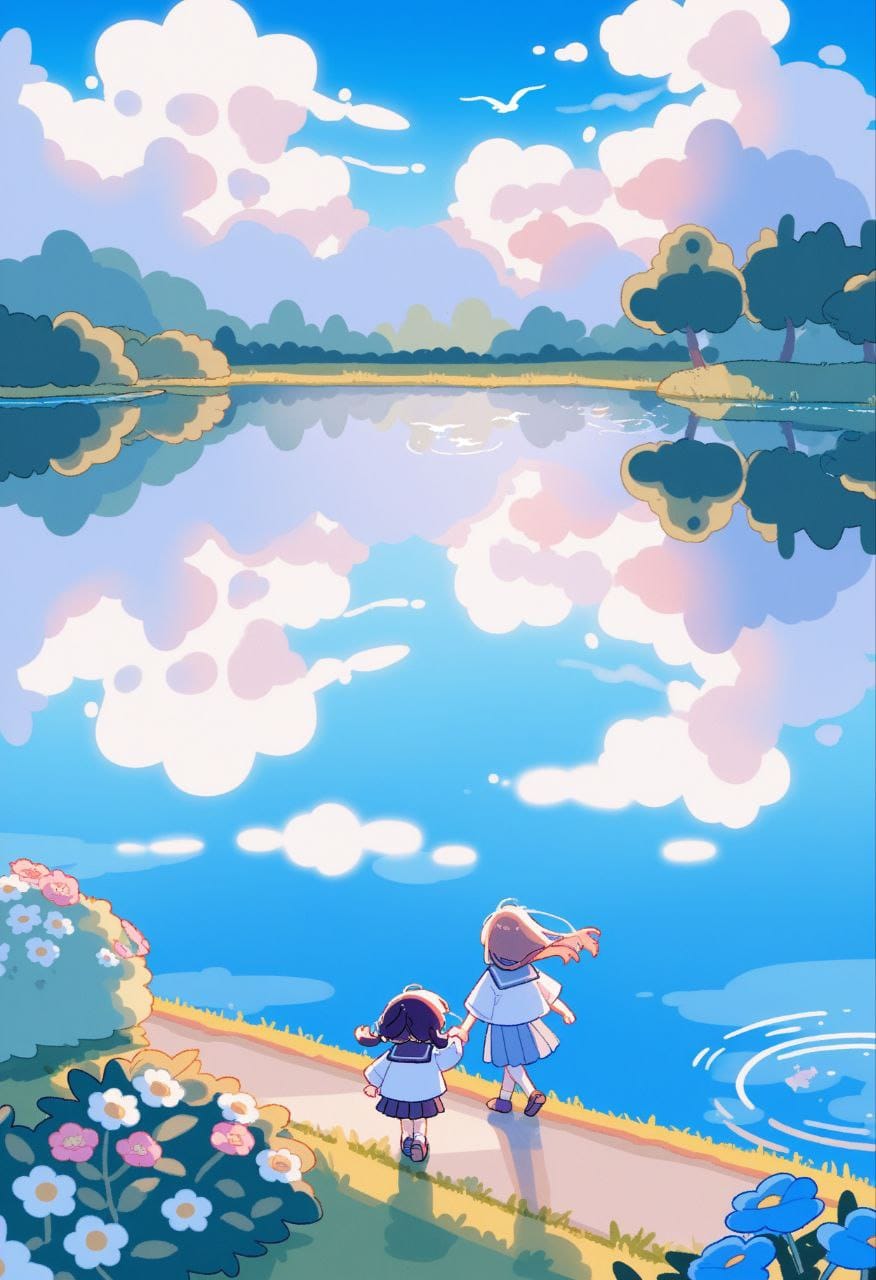 bird, blue flower, bush, cloudy sky, floating hair, flower, sunlight, pink flower, full body, grass, holding hands, lake, outdoors, reflection, reflective water, walking, white flower, looking at another