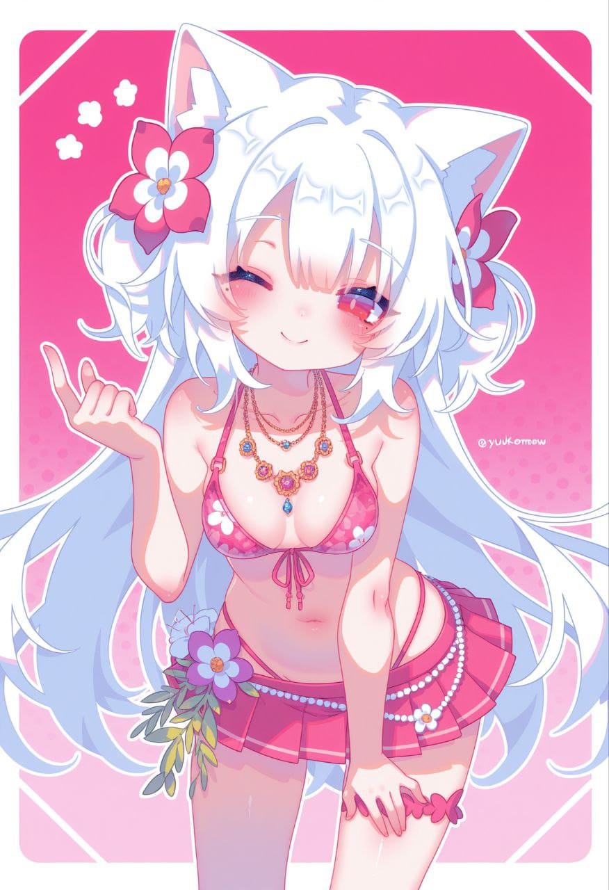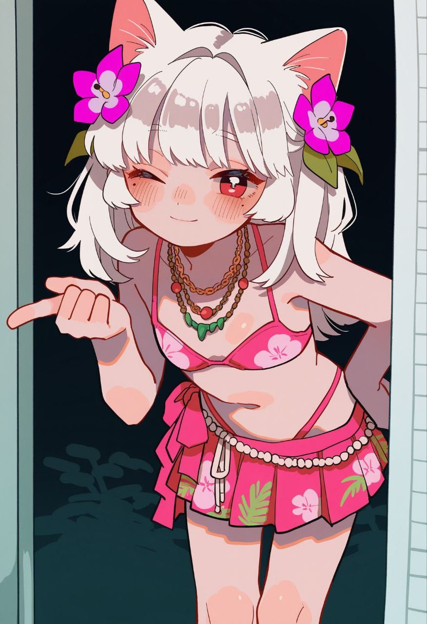 acid pink bikini, bra, lowleg skirt, draped skirt with ruffles and pleats,highleg panties, flower adornment on waist band, multiple necklaces, waist necklaces, pink orchid flower on skirt, hawaiian bikini