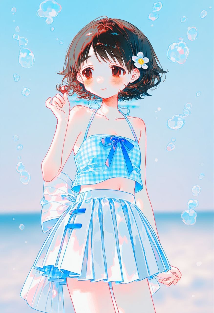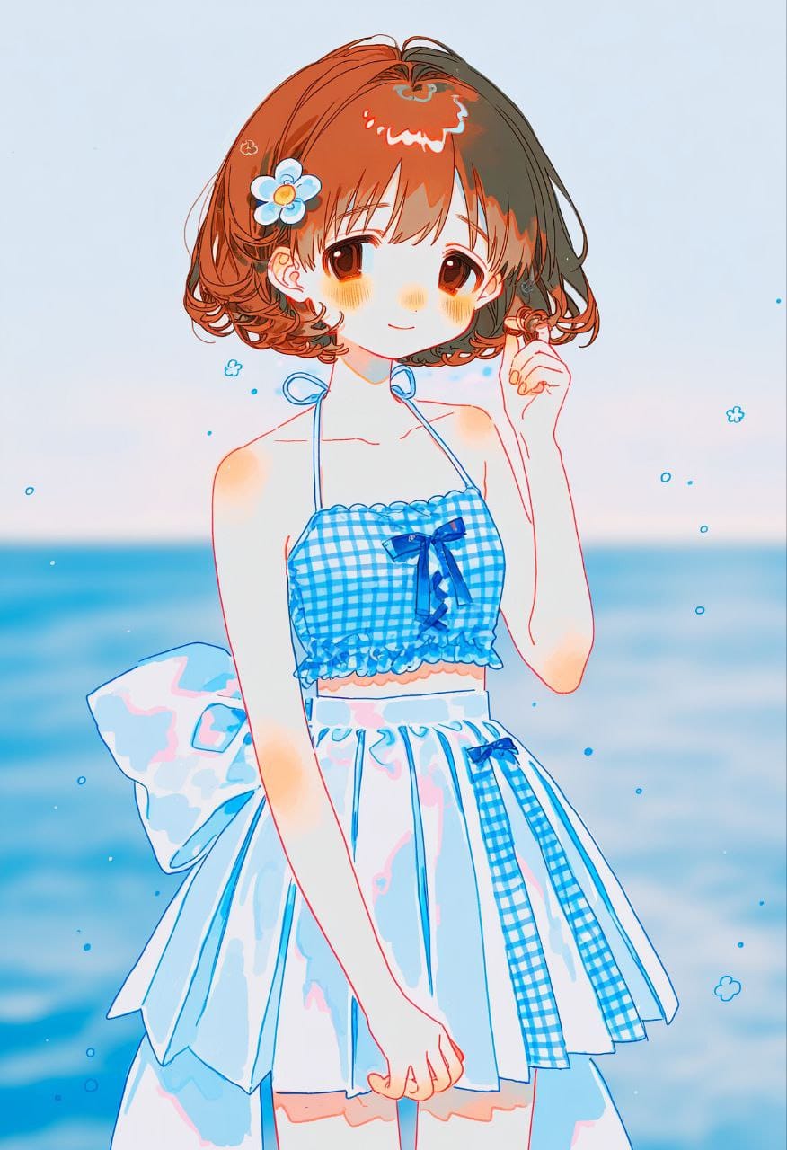 sleeveless, halterneck, light blue top, blue bow on chest, plaid pattern, collarbone, bare shoulders, white skirt, pleated mini skirt, hair flower, white flower, large bow, white bow, bow on back