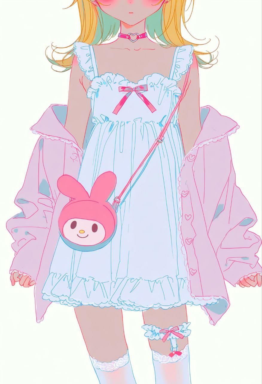 white nightie, (short nightie dress), white lace nightie, sleeveless dress, frilled dress,short jacket, light pink jacket, off shoulder, white stockings, jewelry, shoulder bag, my melody-shaped bag, pink choker, heart choker, long sleeves, sleeves past wrists, brigal garter, pink bow