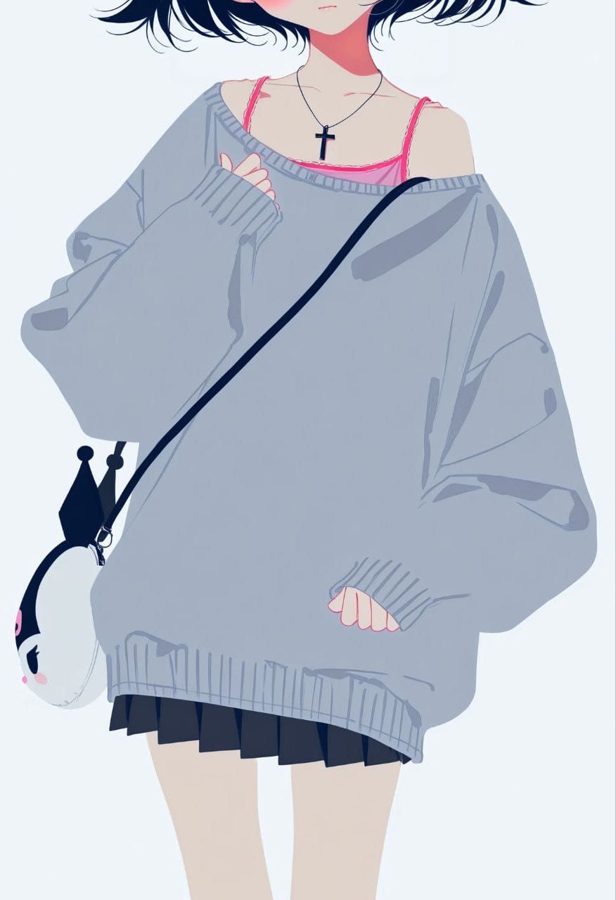 black cross, cross necklace, long sleeves, off shoulder, pleated skirt, black skirt, short skirt, sleeves past wrists, gray sweater, oversized sweater, light pink tank top, laced tank top, tank top under sweater, kuromi-shaped bag