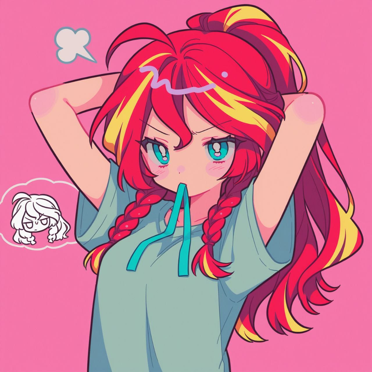 annoyed, arms behind head, braids hair into a ponytail, elastic band in mouth