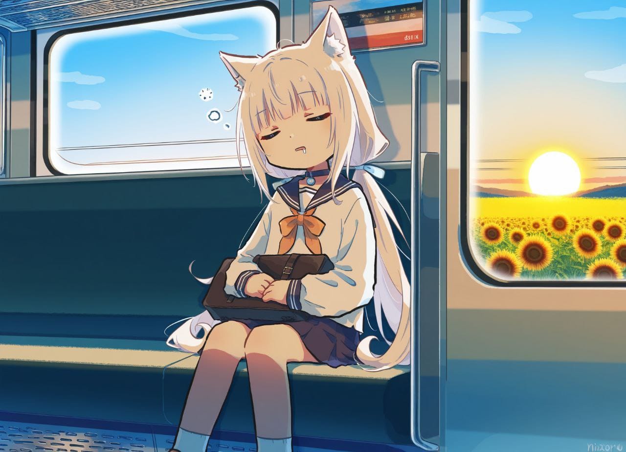 train interior, morning, sun, blue sky, window, bright sun, (warm atmosphere:1.5), meadow outside the window, sunflowers