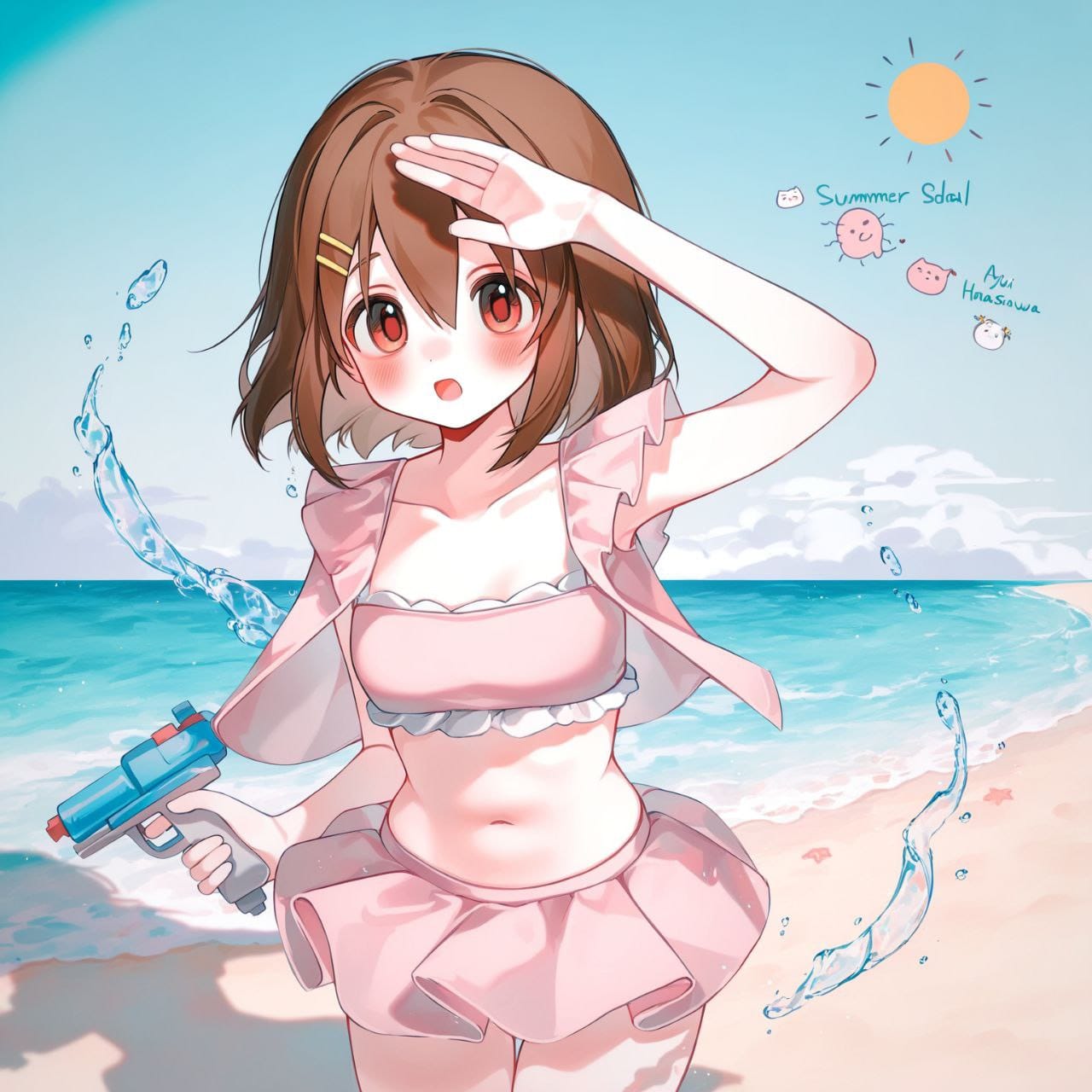 (outside), beach, water sun, inflatable ring, beach theme, sand, water, blue water, waves,donut inflatable ring, donut ornament, pink donut