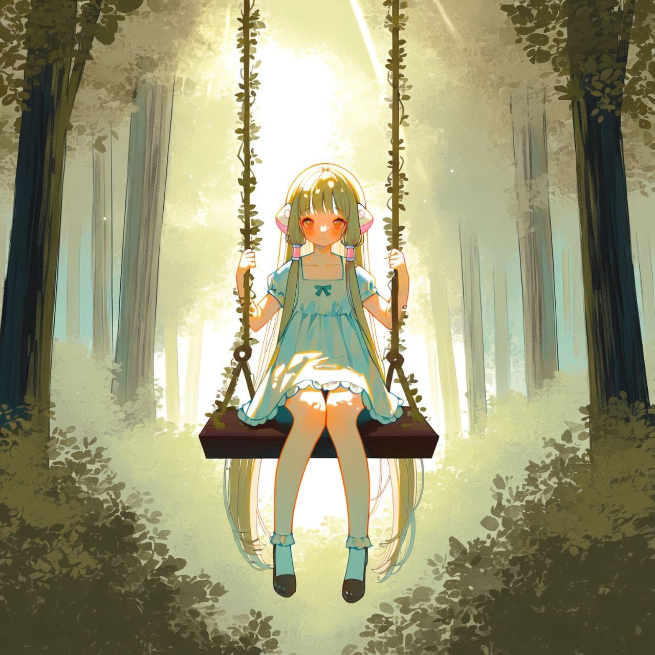 (in forest), day, yellow sun,bushes, dappled sunlight, day, forest, leaf, light rays, nature, outdoors, painting \(medium\), plant, scenery, sunlight, swing, (the swing tied to trees) vines on swing