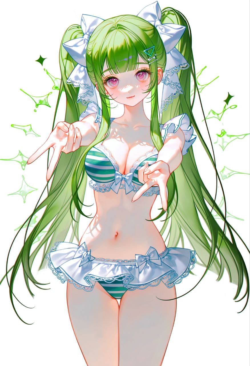 white background, frills bra, frills panties, large bows on the sides, micro white skirt, collarbone, bare arms