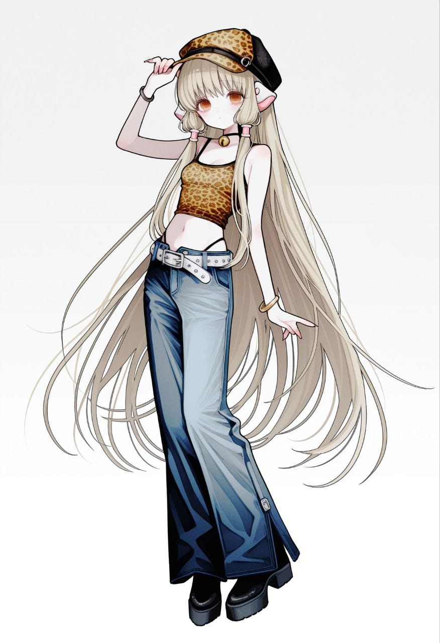 bare shoulders, leopard print tank top, neck bell, black bracelets on hands, false nails, dark blue jeans, bell-bottoms, unbuttoned, cabbie hat animal print, y2k outfit, black boots, black highleg panties, belt, white belt, stomach, navel