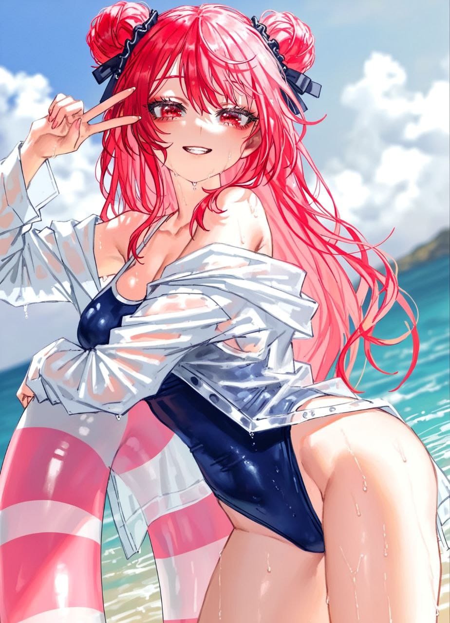 highleg one-piece swimsuit, leaning on object \(swim ring\), wet clothes, ocean, innertube, v