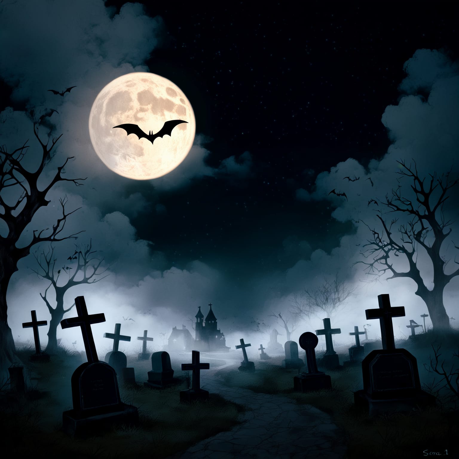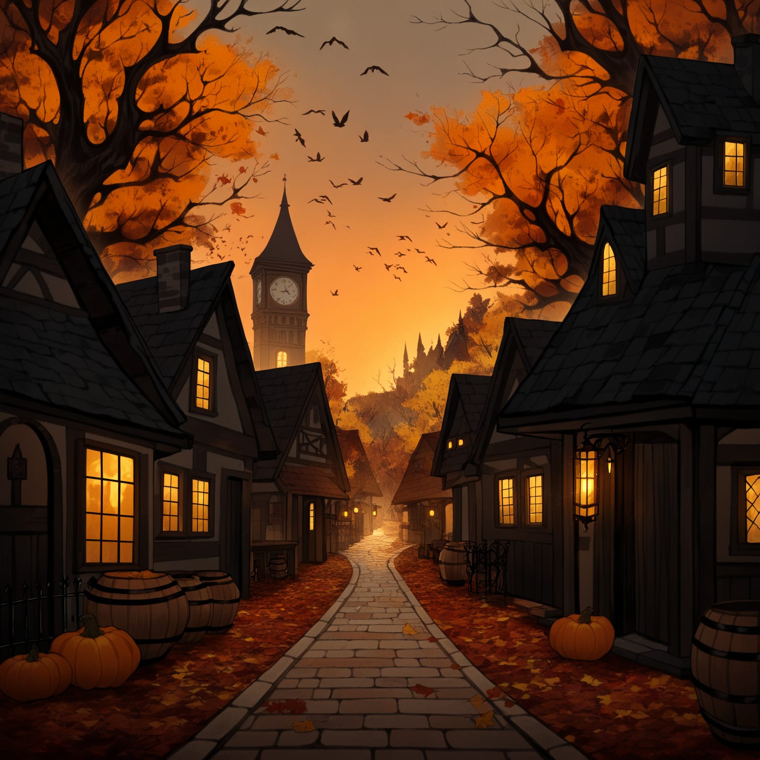 black theme, orange theme, dark, scenery, outdoors, autumn, orange sky, orange fog, bare tree, autumn leaves, flock, pumpkin, brick road, village, street, house, clock tower, iron fence, lantern, glowing light, barreldark, scenery, outdoors, night, full moon, moonlight, star (sky), black cloud, fog, bare tree, grass, path, graveyard, grave, tombstone, cross, bat (animal)