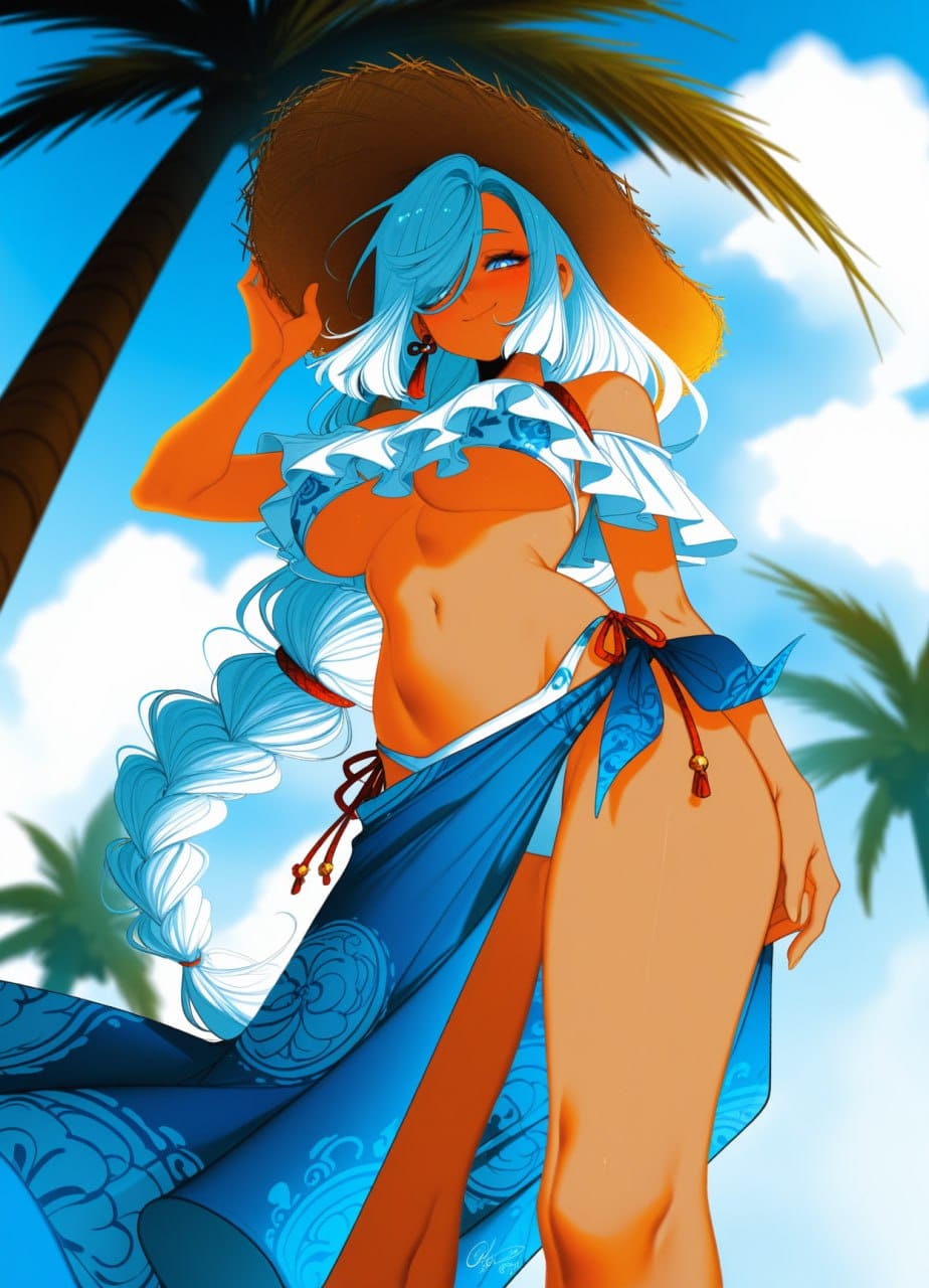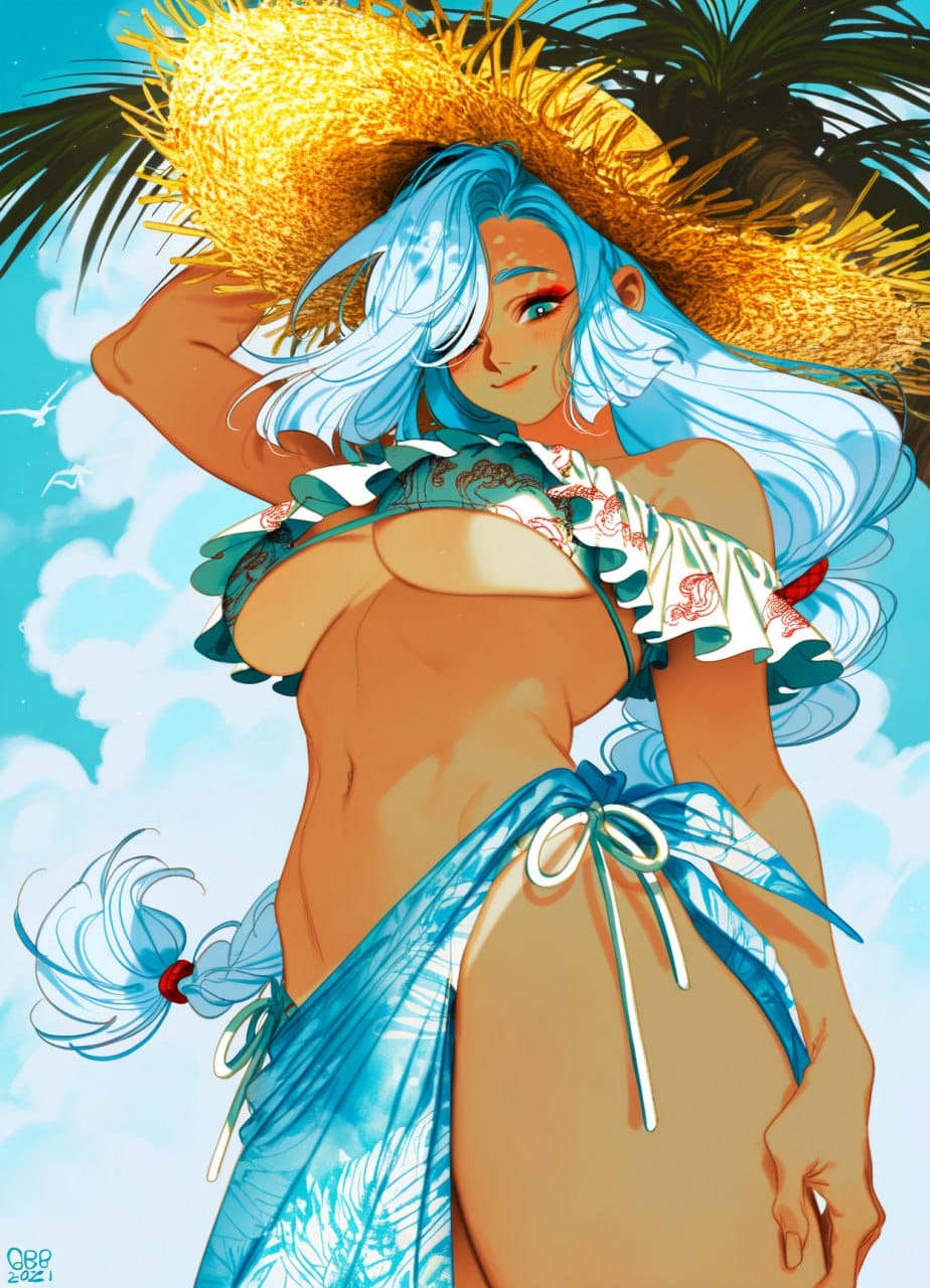 straw hat, white bikini, print bikini, frilled bikini, underboob, bare shoulders, off-shoulder bikini, navel, stomach, side-tie bikini bottom, blue sarong, print sarong, blue cross-laced sandals