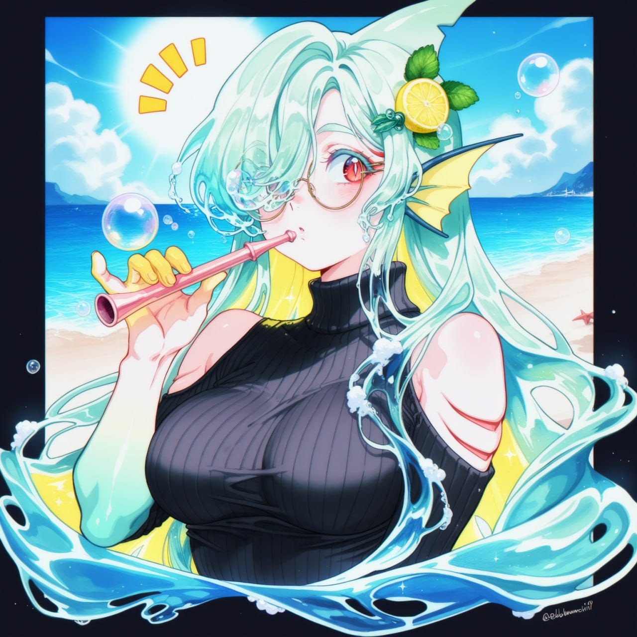 upper body, white border, outside border, sparkle, outdoors, sun, sunlight, sea, beach, cropped torso