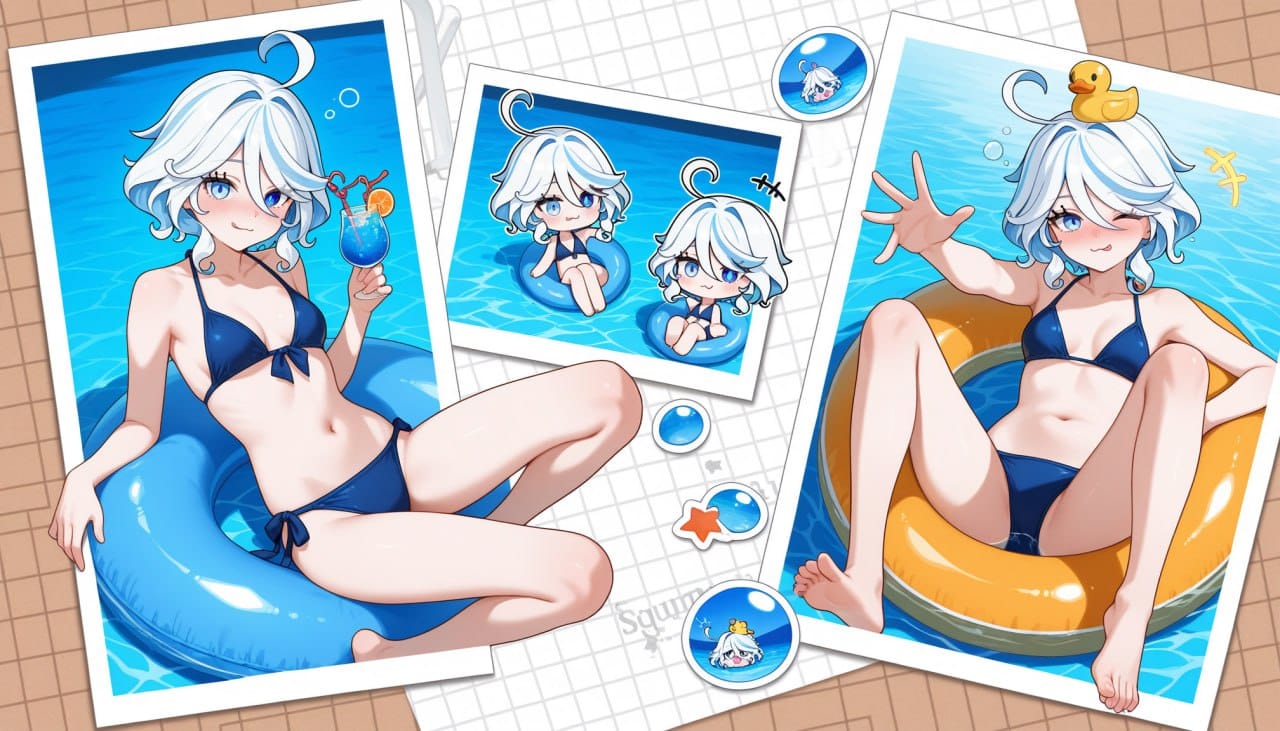 white background, blue background, grid background, (polaroid photo, collage background, multiple views, chibi inset, sticker, bubble:1.2)