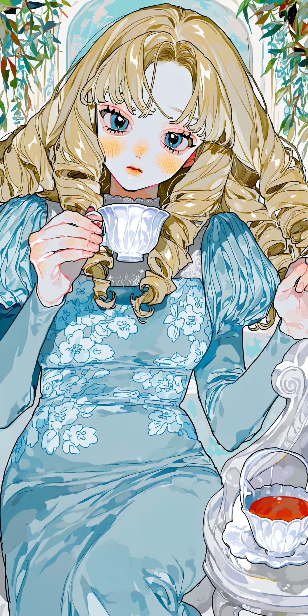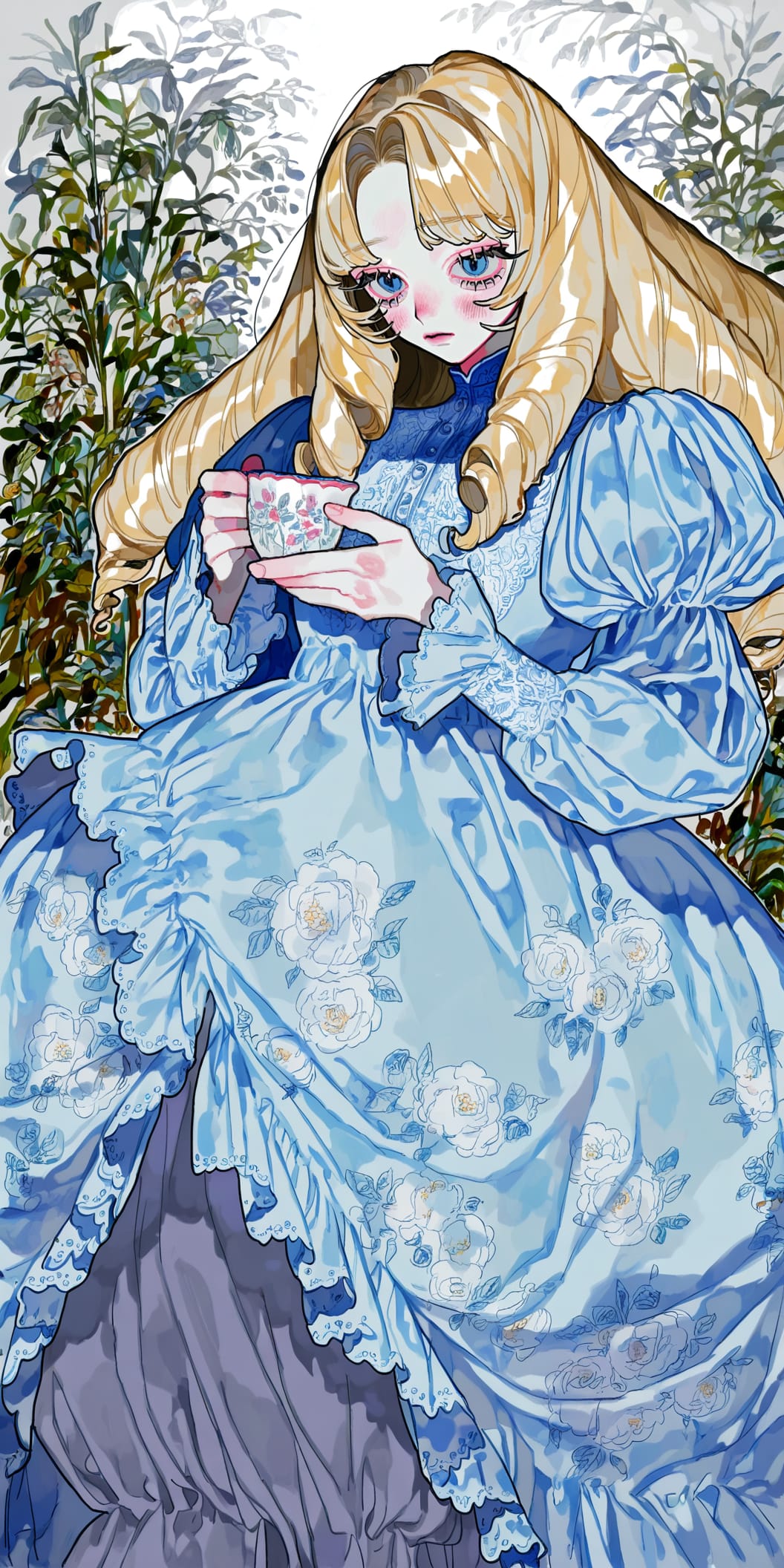 Я хочу, чтобы моя персонажка была одета в аристократичное платье, пишу промпт — blue gown, floral print gown, puff and slash sleeves, long sleeves