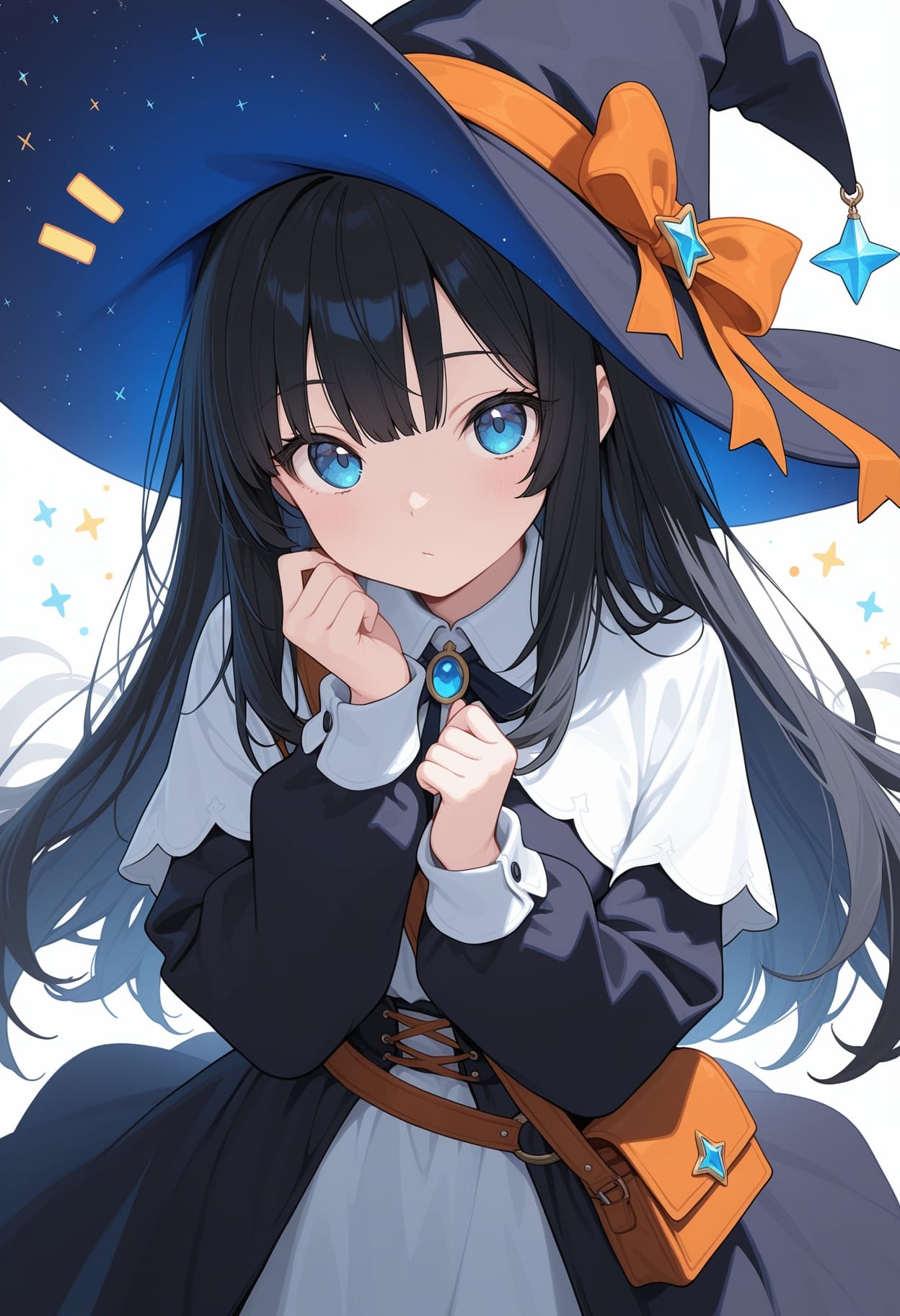 🎨 1girl, solo, cute, witch, witch hat, black hair, blue eyes, looking at viewer, nama udon, rikuwo, jane mere, otonoha aika