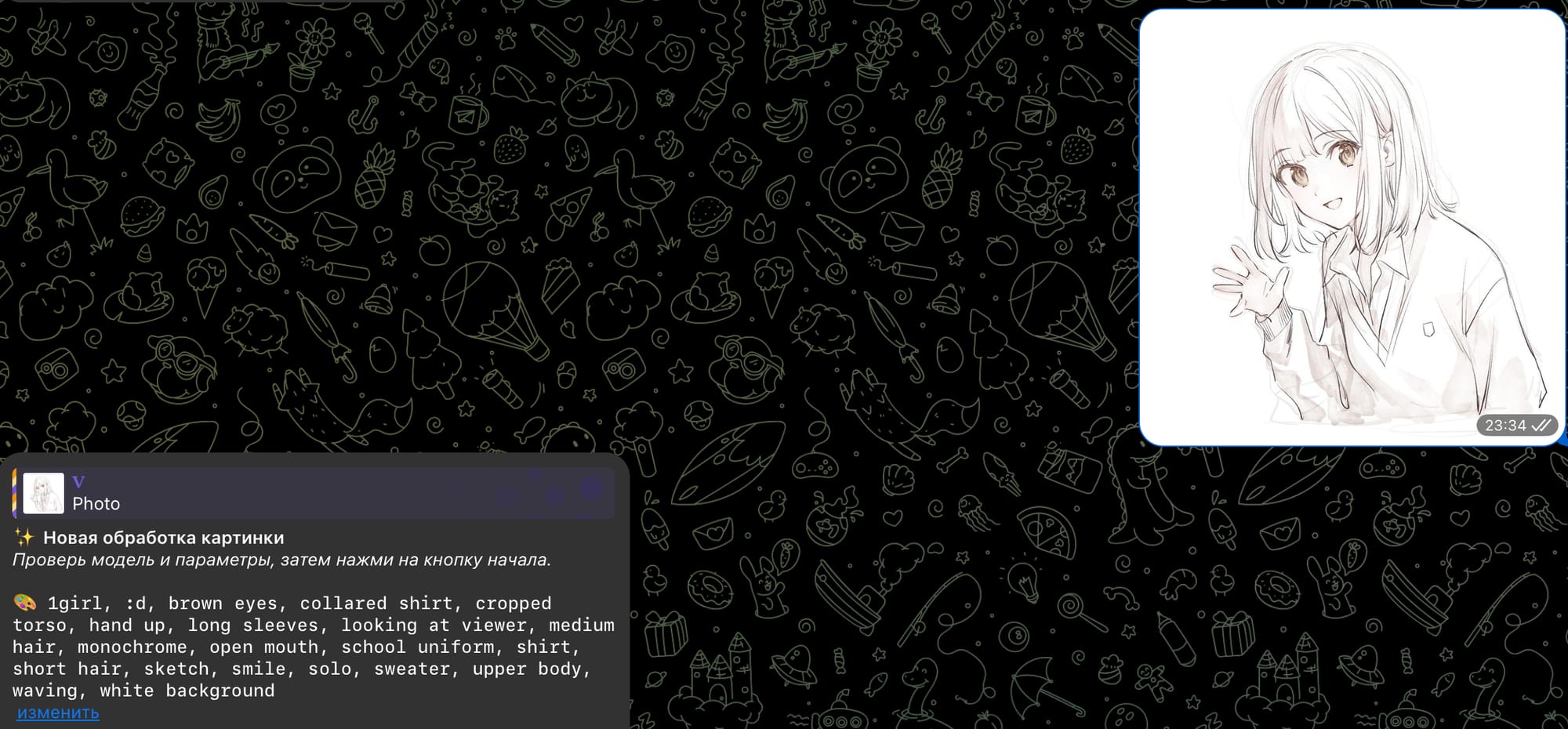 - Вы можете нарисовать набросок для арта и отправить его боту, чтобы он дорисовал его в стиле модели, сохранив заложенные вами черты!