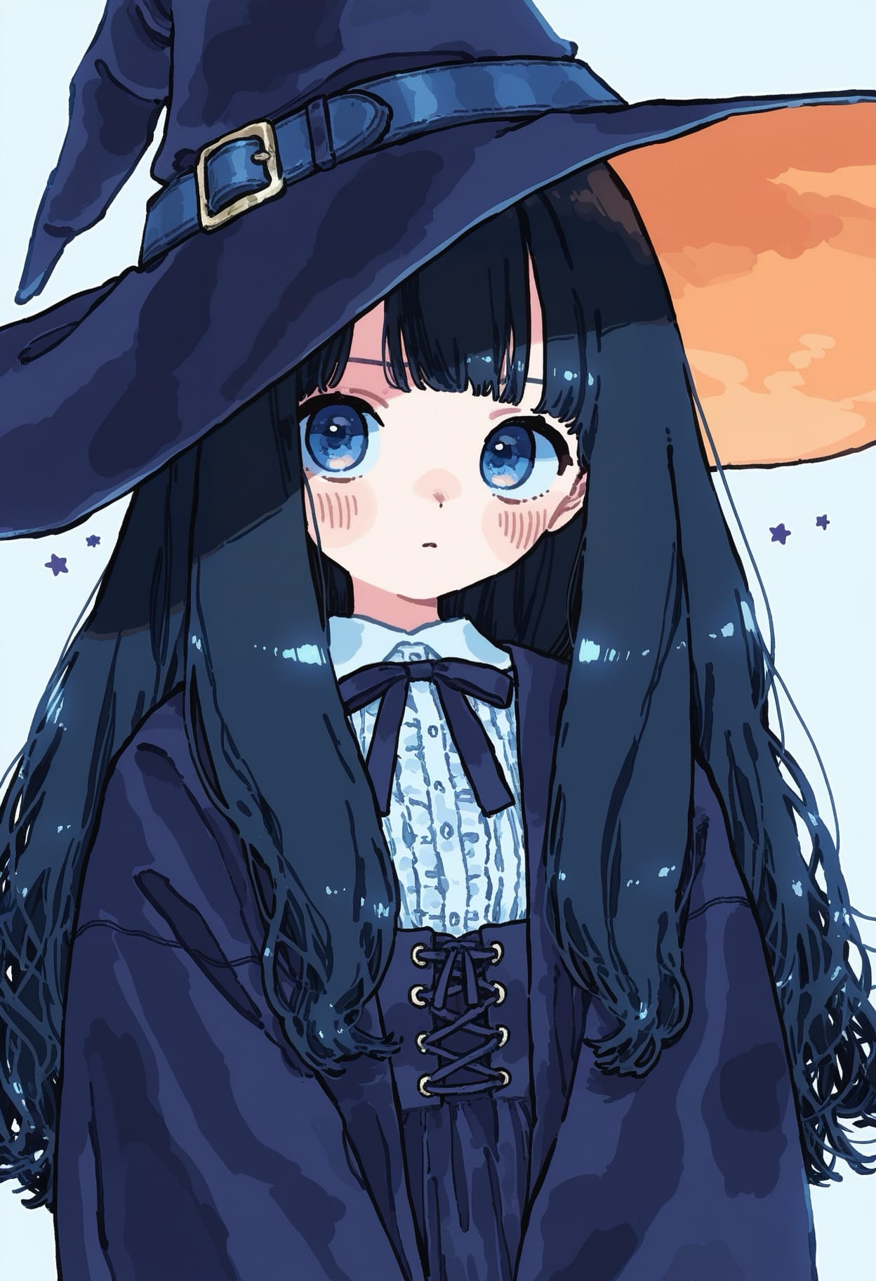 🎨 Милая ведьма с шапочкой ведьмы, у неё черные волосы и голубые глаза, смотрит на зрителя