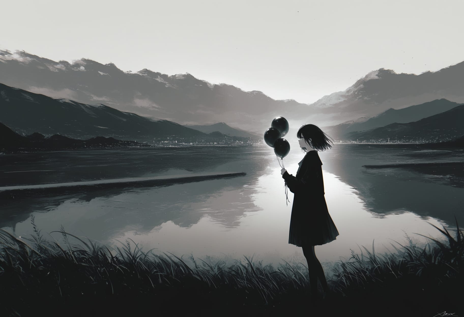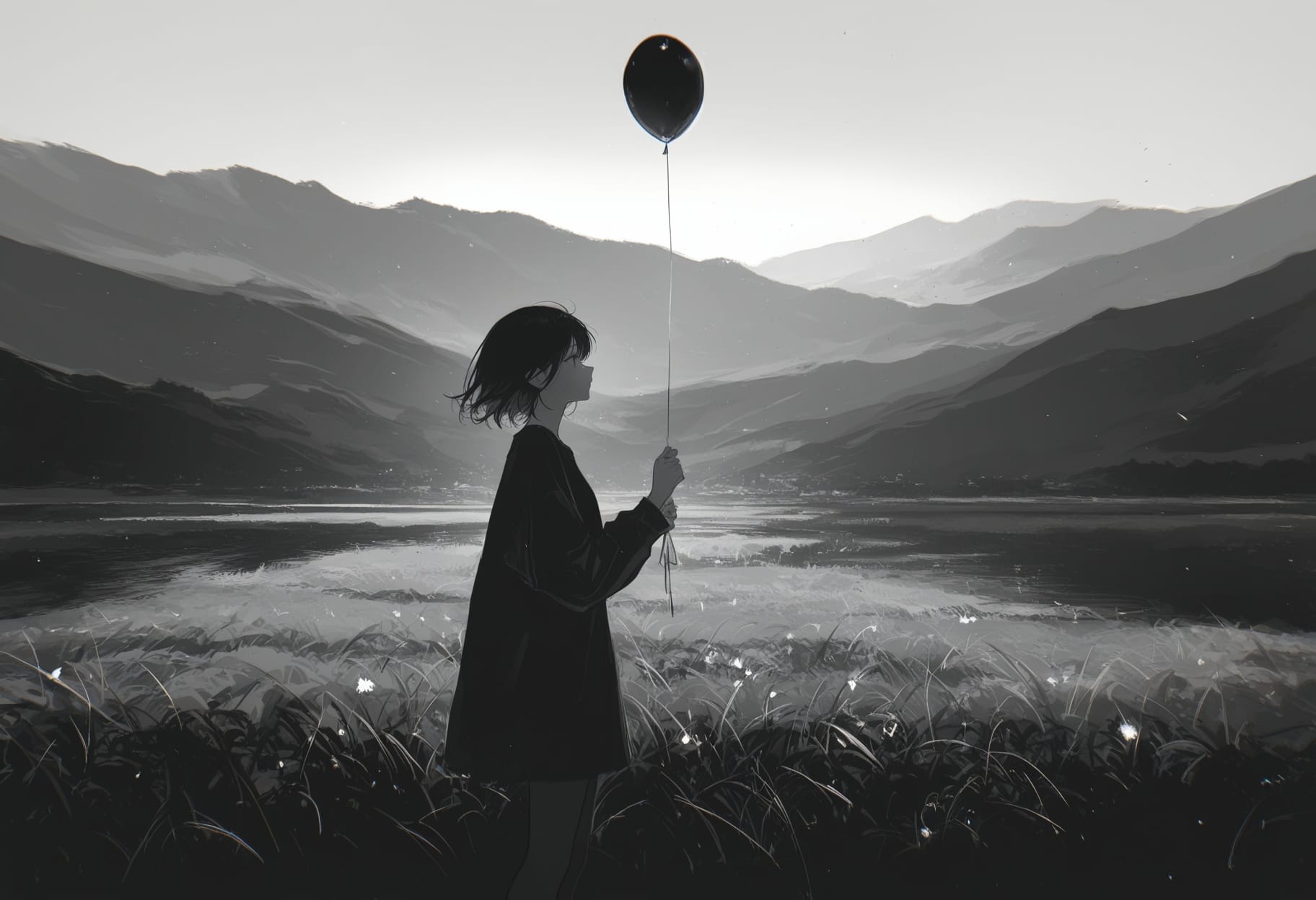 🎨 1girl, solo, holding balloons, scenery, from side, monochrome, xbsx, 52hertz