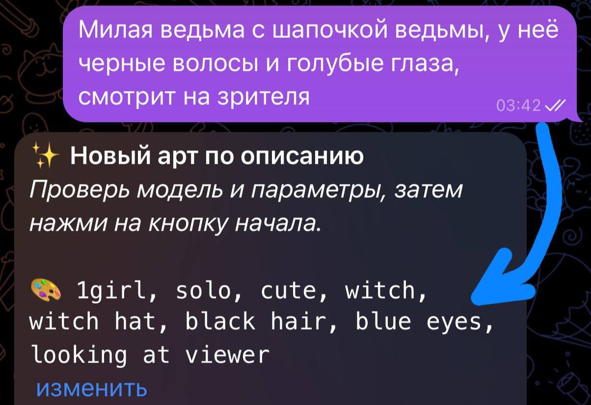 Бот составил из нашего описания теги, понятные моделям ИИ. Если вы нашли в них неточность, можно нажать на ввод в ответе бота, чтобы скопировать, затем отредактировать и отправить свою версию.