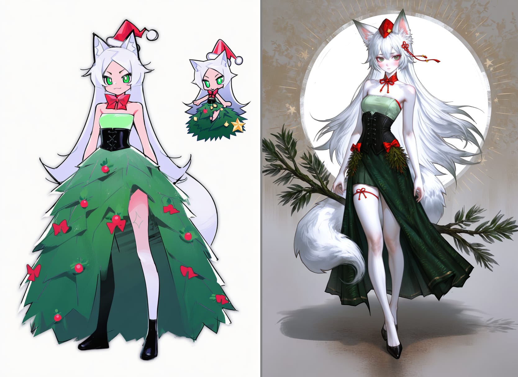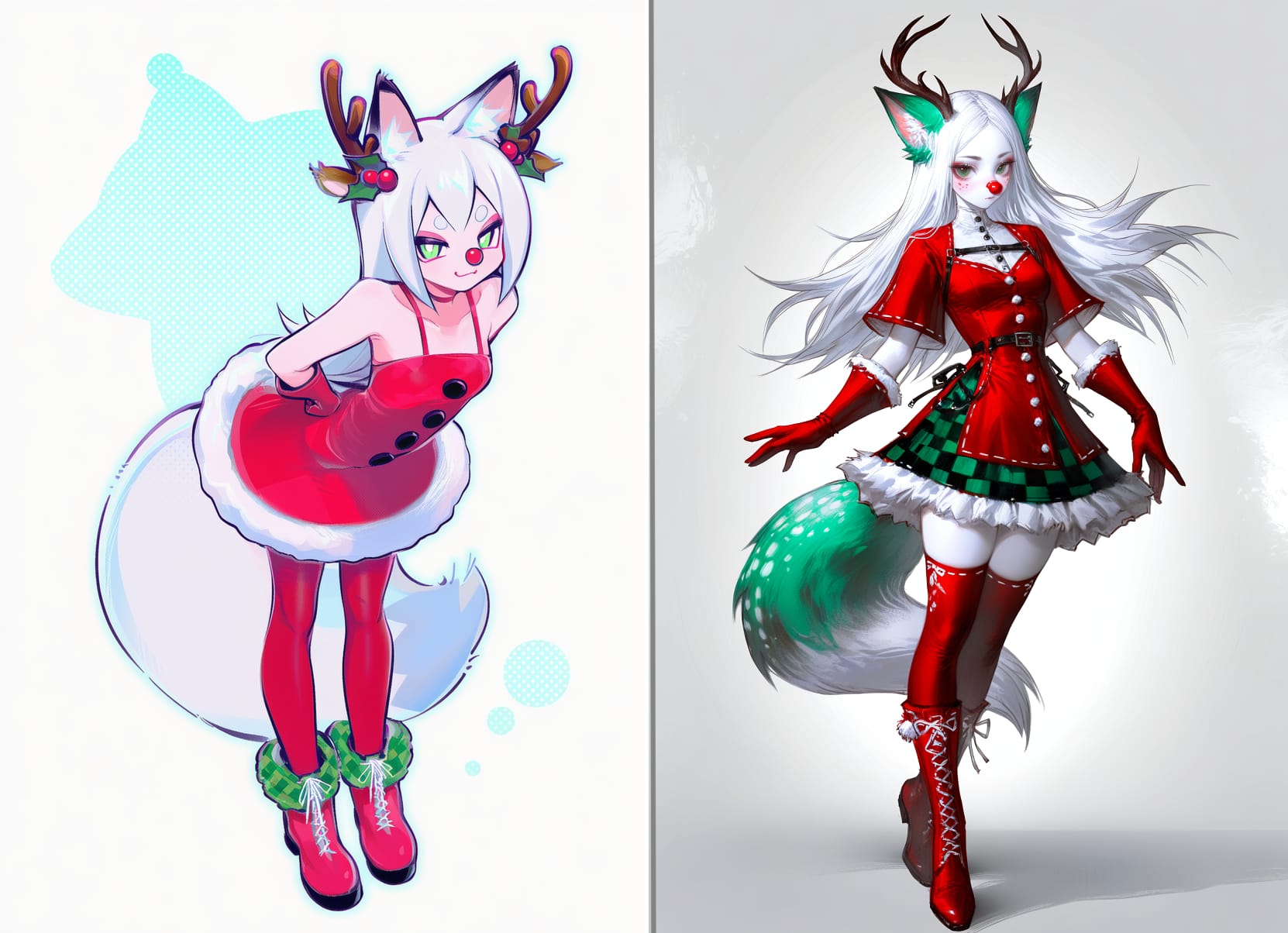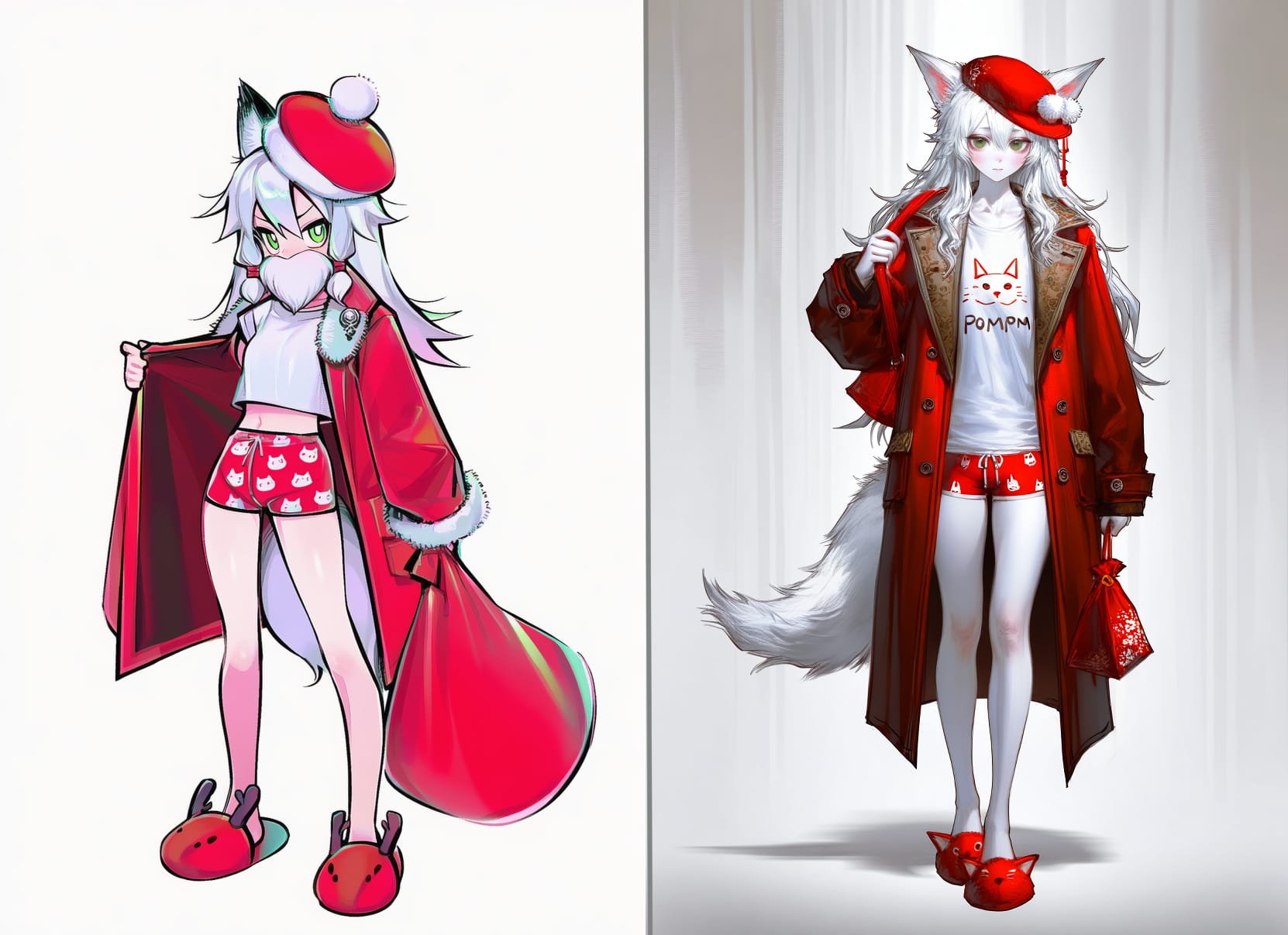 snow crown, light blue cloak, translucent cloak, snowflakes on the cloak, shoulder pads, white jacket, fitted jacket, white pants, classic pants, black shoesred dress, strapless dress, white pom-poms on a dress, short dress, white gloves, long gloves, white tights, brown boots, high boots, red bows in the hair, full skirt, fitted at the waist, white frill on a skirtwhite bodysuit, stripes on bodysuit, red stripes, santa hat, long hat, pom-pom with hat, white cuffs, puffy cuffs, barefootwhite dress, short dress, white shorts, fluffy shorts, red bows on shorts, fairy wings, red wings, red hat, cone-shaped hat, red bolero, red capelet, pom-pom on hat, black stockings, red shoes, oversized shoes, speed shoes light green dress, strapless dress, black corset, dark green skirt, skirt made of spruce branches, spruce toys on skirt, long skirt, cutout on leg on the skirt, red bows, new year's toys on skirt, no sleeves, red bow on the neck, star hat, red hatwhite dress, pleated skirt, mini skirt, leggings, shaggy leggings, white bolero, white hat, witch hat, snowflake hat, black tights, black shoesblack pants, white shirt, puff sleeves, lace shirt, red hat, mushroom hat, fly agaric hat, red shoes, mario shoesclown collar, white collar, cap, red cap, pompom on the cap, costume, clown costume, two colored costume (red and blue), white buttons on a suitred coat, open coat, silver ornament on coat, white t-shirt, red boxer shorts, white cat print on shorts, white lush beard, beard with ties, red hat, new year's hat, fur on a hat, pompom on a hat, red bag over the shoulder, holding the bag with his hand, slippers, red slippers, deer slippersdeer antlers, antlers on a rim, red pompom on the nose, red dress, dress with straps, mini dress, fluffy skirt, fitted waist dress, black buttons on the dress, white fur on the skirt, green checkered skirt, red stockings, red boots, boots with green fur, white laces, red gloves, high gloveswhite face, black eyeshadow, eyeshadow around the eyes, (carrot nose, snowman nose:1.5), red lips, grey scarf, white dress, long sleeves, black buttons, black tights, white socks, black sneakers, black hatgreen round ball costume, white snowflakes on the ball, white bow on the ball, green suit, open face, smiling, green roller skatescosplay mushroom, hat mushroom, white blouse,flared sleeves,loose blouse,high collar,cropped blouse,short top,flowy sleeves,high-waisted blouse, black underbust corset, red cycling shorts, striped stockings (white and red), black boots