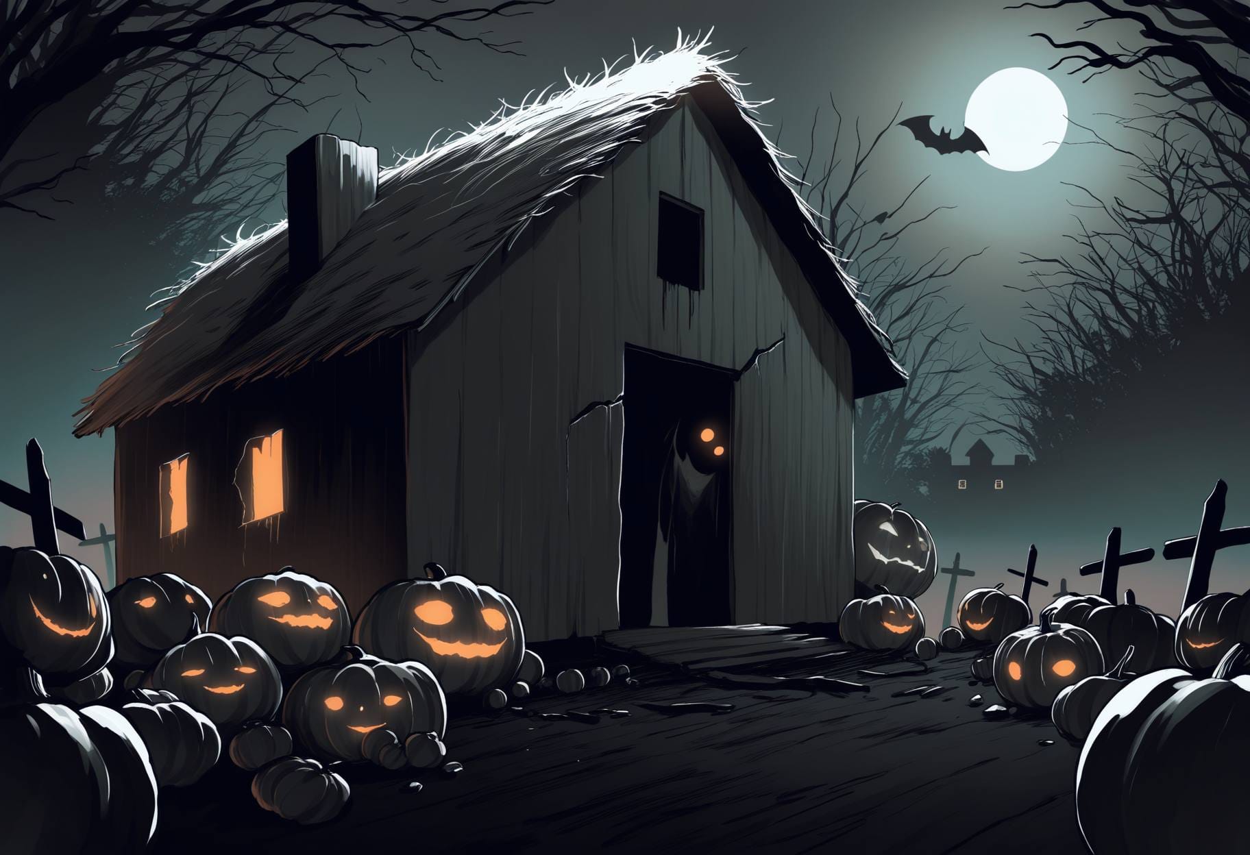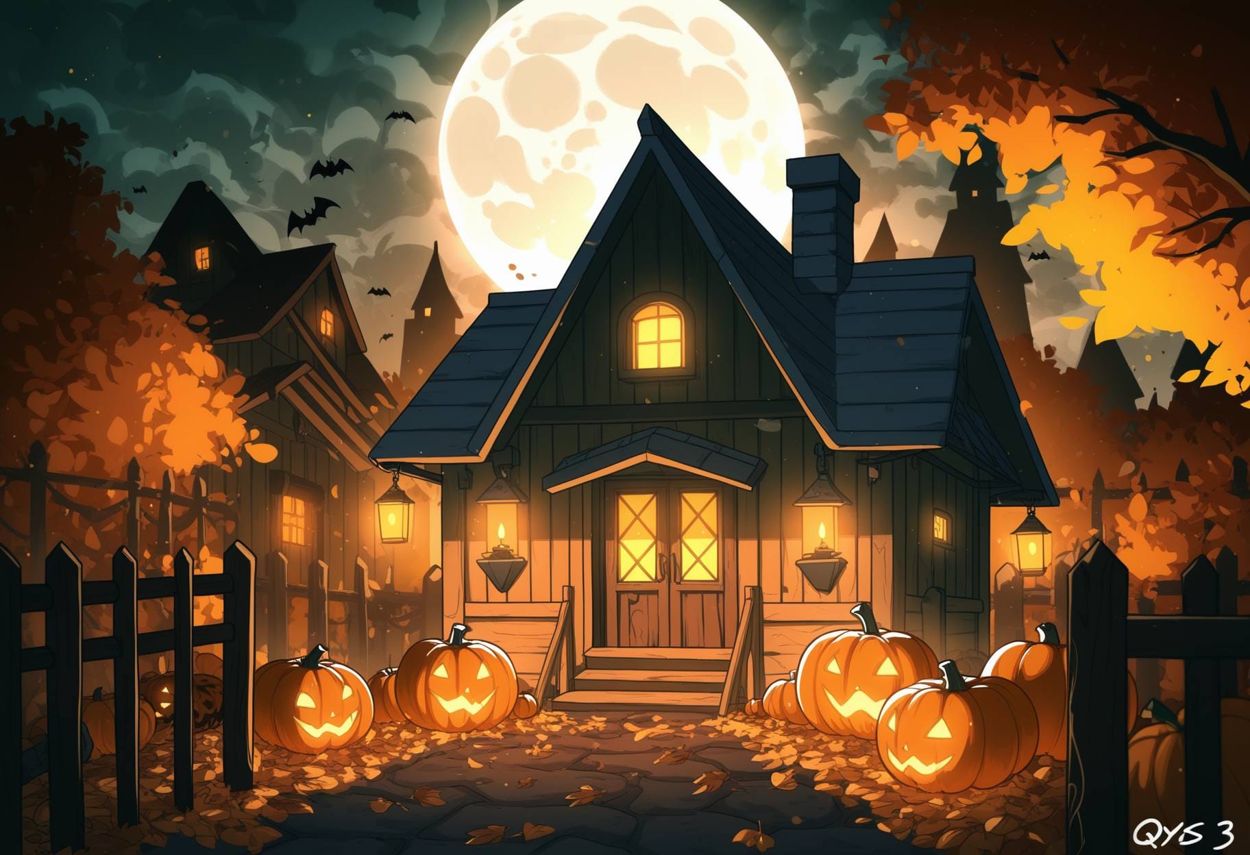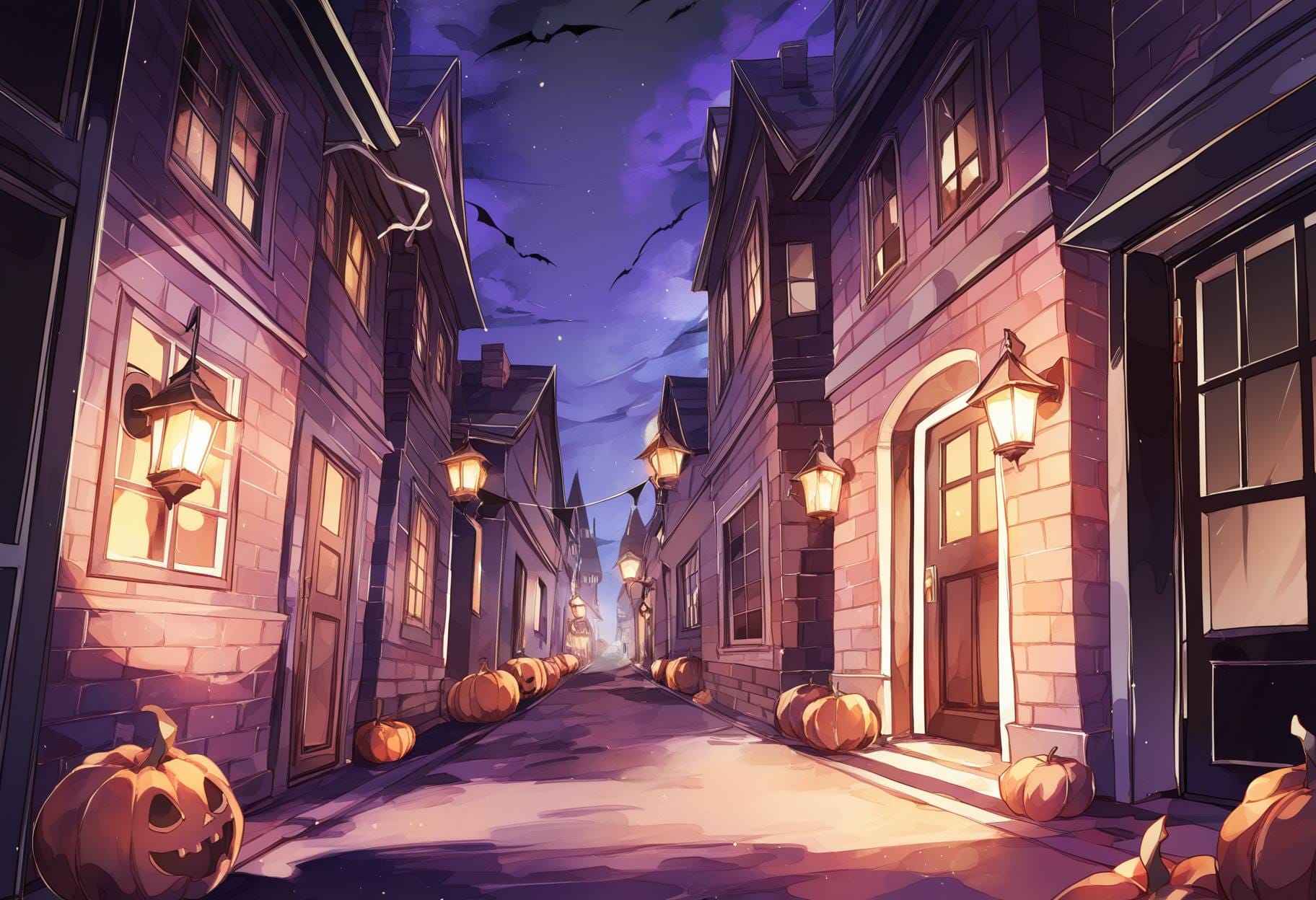halloween background, victorian street, gas lanterns, brick houses, foggy night, pumpkins by doors, vintage spooky charmhalloween background, ancient stone ruins, glowing runes, vines, soft fog, magical purple light, mysterious fantasy atmospherehalloween background, old wooden farmhouse, broken windows, dry cornfield, carved pumpkins, pale moonlight, creepy silencehalloween background, graveyard under full moon, glowing candles, misty air, dark trees, calm eerie nighthalloween background, modern city street, glowing jack-o’-lanterns, neon signs, fog, reflections on wet asphalt, spooky festive moodhalloween background, haunted castle interior, moonlight, spider webs, candles, red curtains, gothic moodhalloween background, witch cottage interior, potions, candles, black cat, cauldron, warm light, rustic magic atmosphere, halloween background, enchanted autumn forest, glowing pumpkins among the trees, magical fireflies, faint mist, moonlight shining through branches, ancient stone ruins covered with ivy, soft sparkles in the air, warm gold and cool violet tones, mysterious yet beautiful atmosphere, cinematic lighting, highly detailed fantasy background,halloween background, dark gothic cemetery, old stone tombs and crosses, iron fence, full moon glowing behind clouds, black crows flying, candles flickering near graves, mist covering the ground, cold blue and silver tones, spooky atmosphere, detailed gothic architecture, cinematic shadows, fantasy style, highly detailed background, halloween background, cozy spooky village, small wooden houses with candlelight windows, pumpkins on doorsteps, lanterns hanging on fences, full moon in the cloudy sky, light fog, fallen leaves, warm orange and brown tones, autumn night, detailed, cinematic lighting, fantasy style, soft atmosphere, highly detailed background