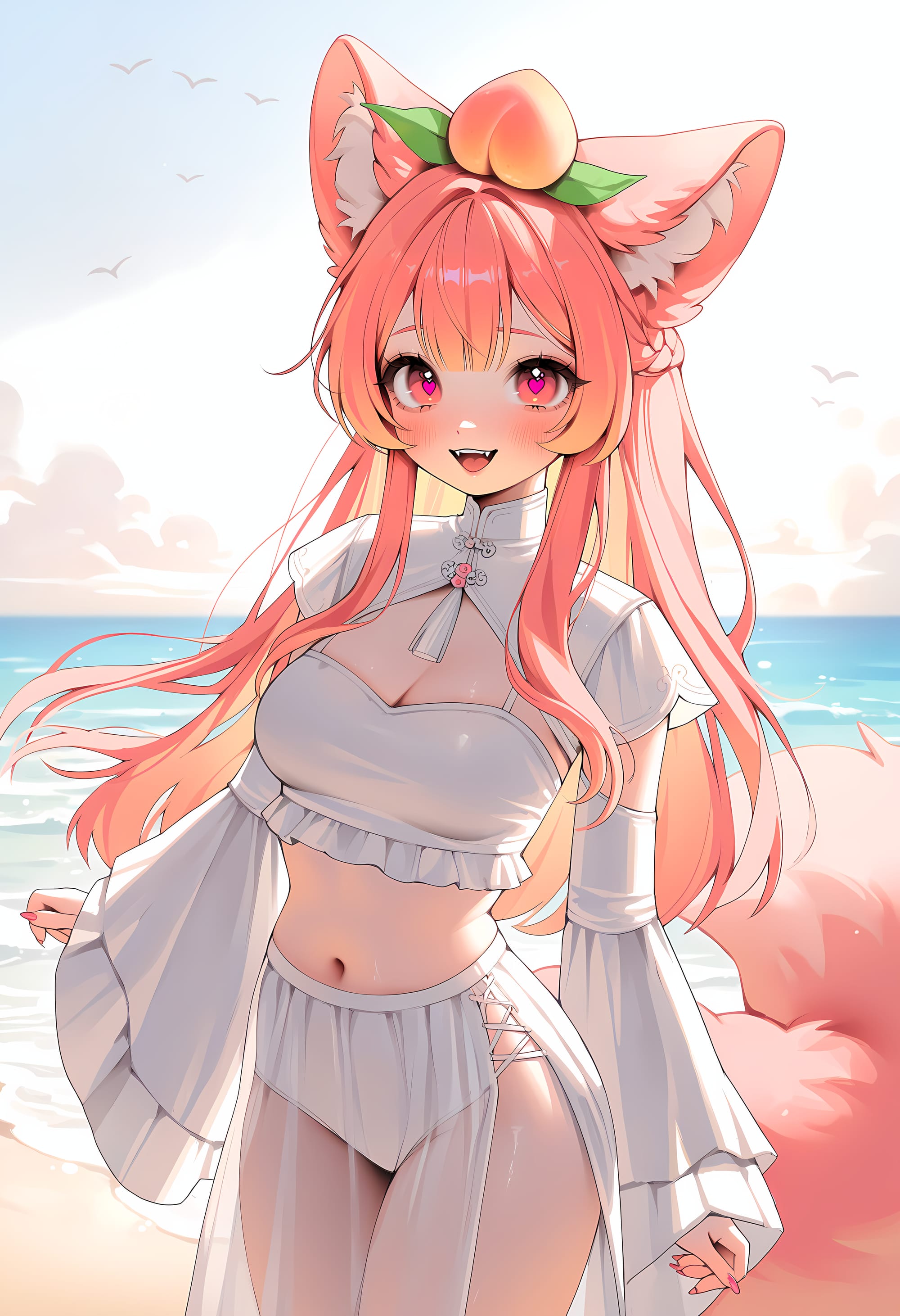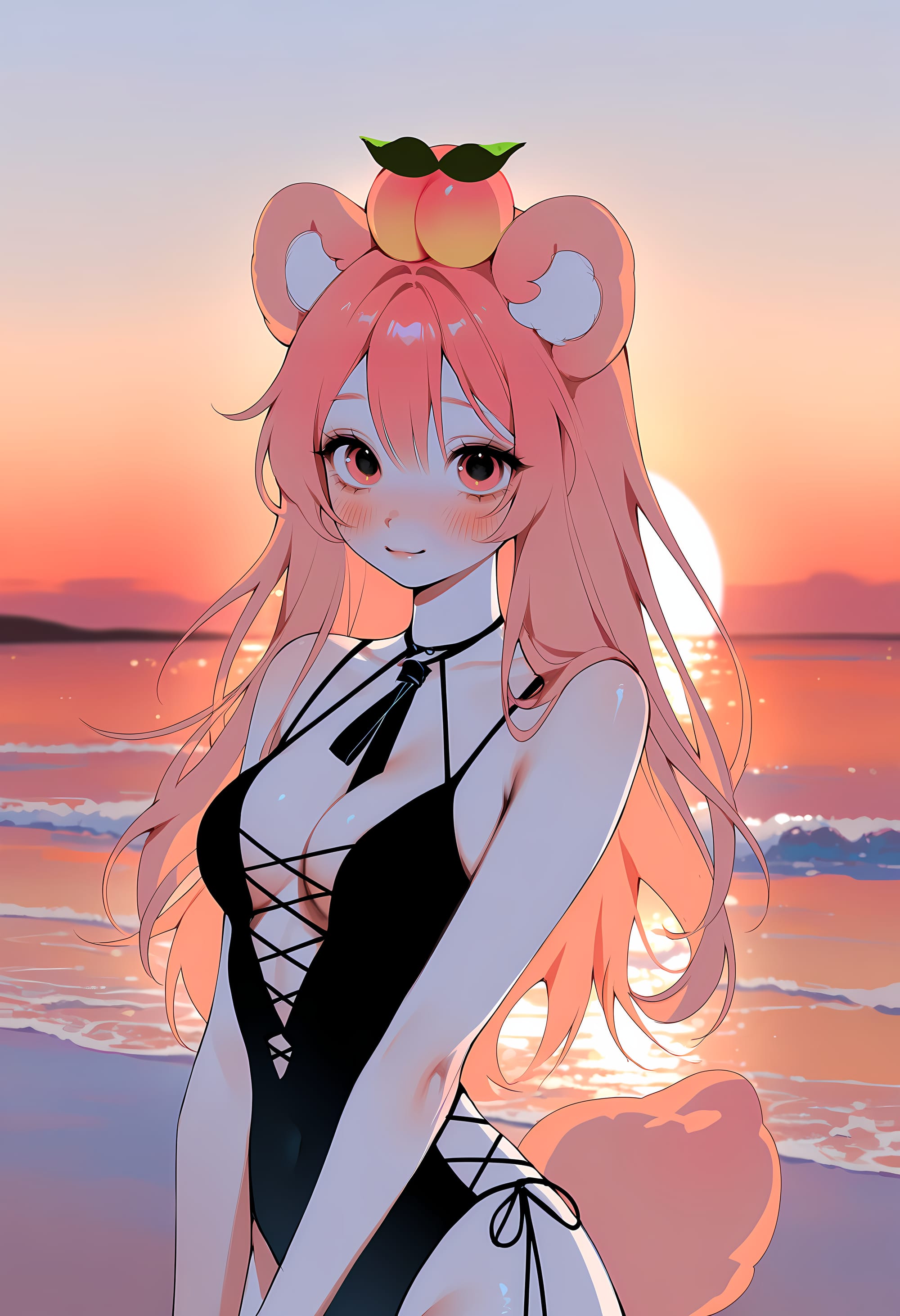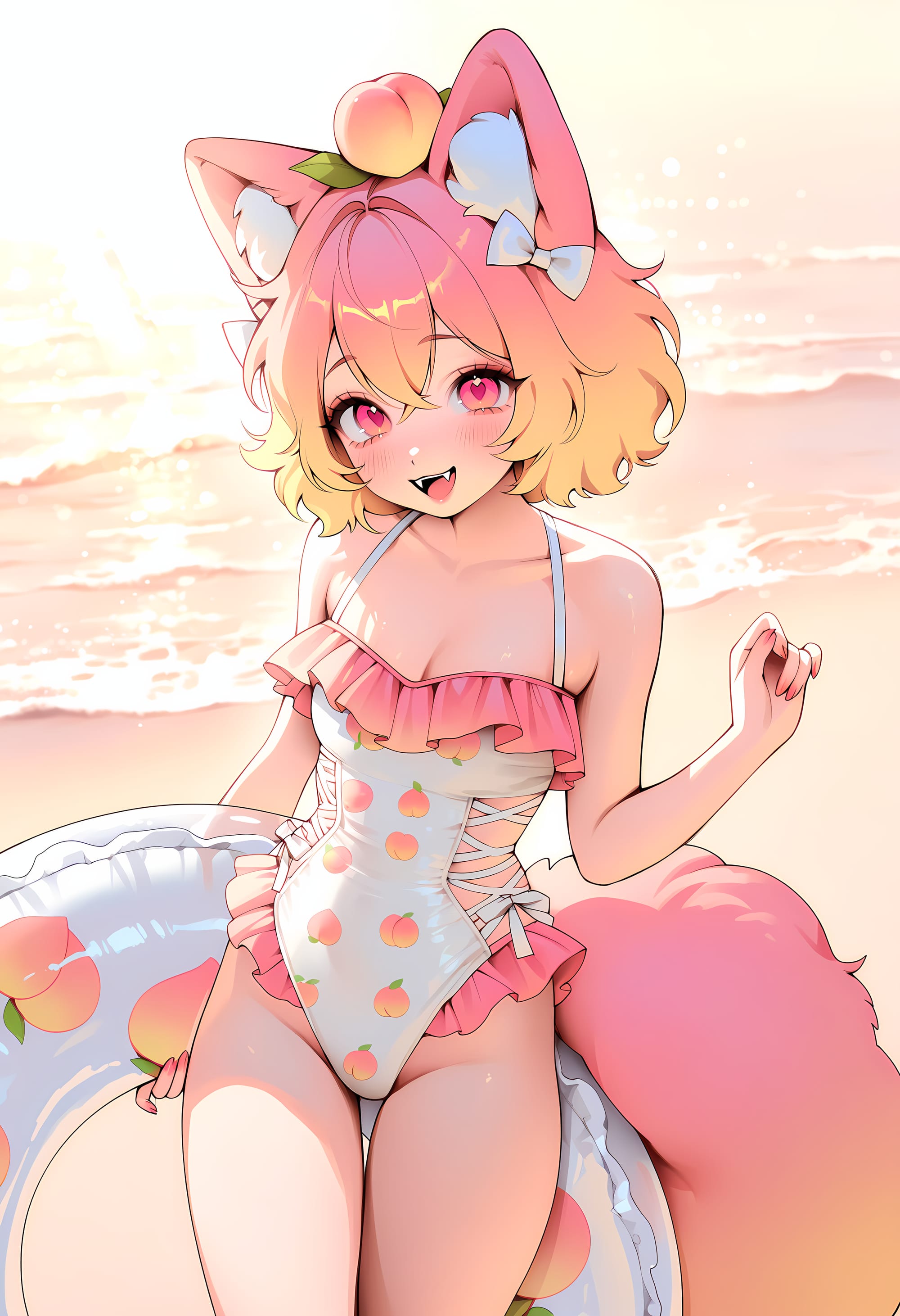 peachy swimwear, cross-laced swimwear, frilled one-piece swimwear, holding swim ring, white bows on swimwear, white ruffles around edges swimsuit