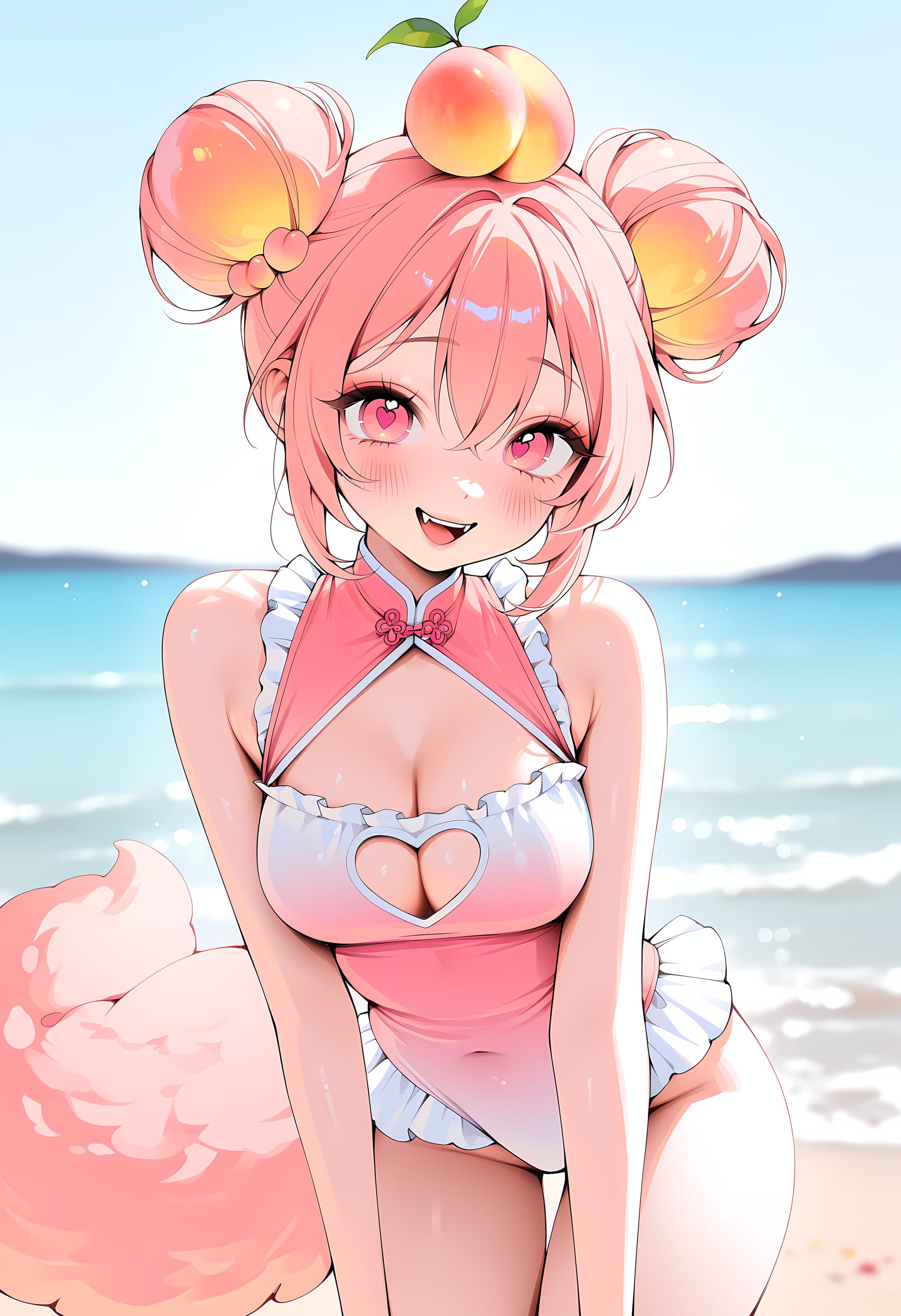 (breasts:1.3), peachy swimwear, cleavage cutout, frilled leotard, frills, peachy one-piece swimwear, white ruffles