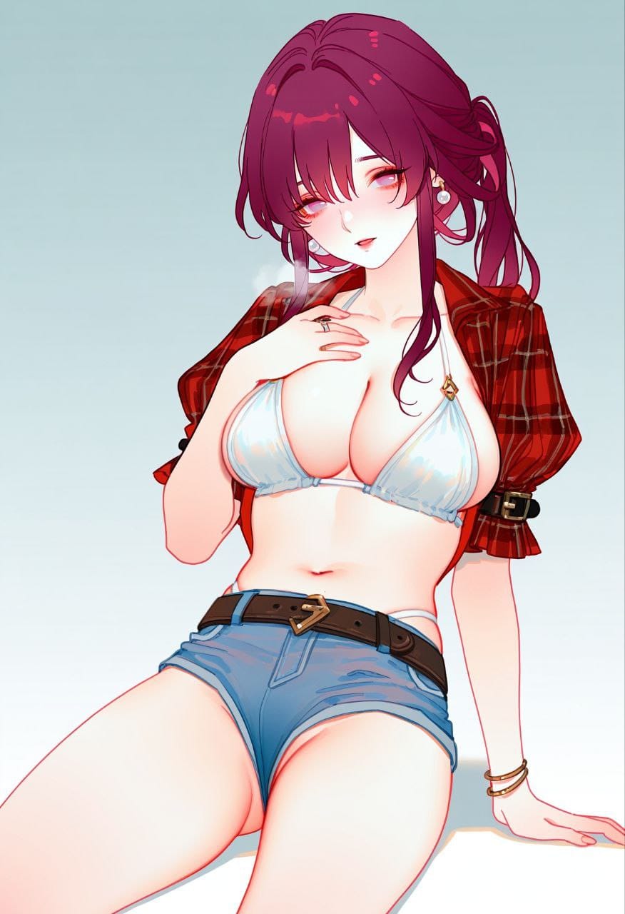 belt, bikini, blue shorts, cleavage, denim shorts, navel, open shirt, plaid shirt, red shirt, short shorts, short sleeves, sideboob, white bikini, juliet sleeves, highleg bikini, side-tie bikini bottom