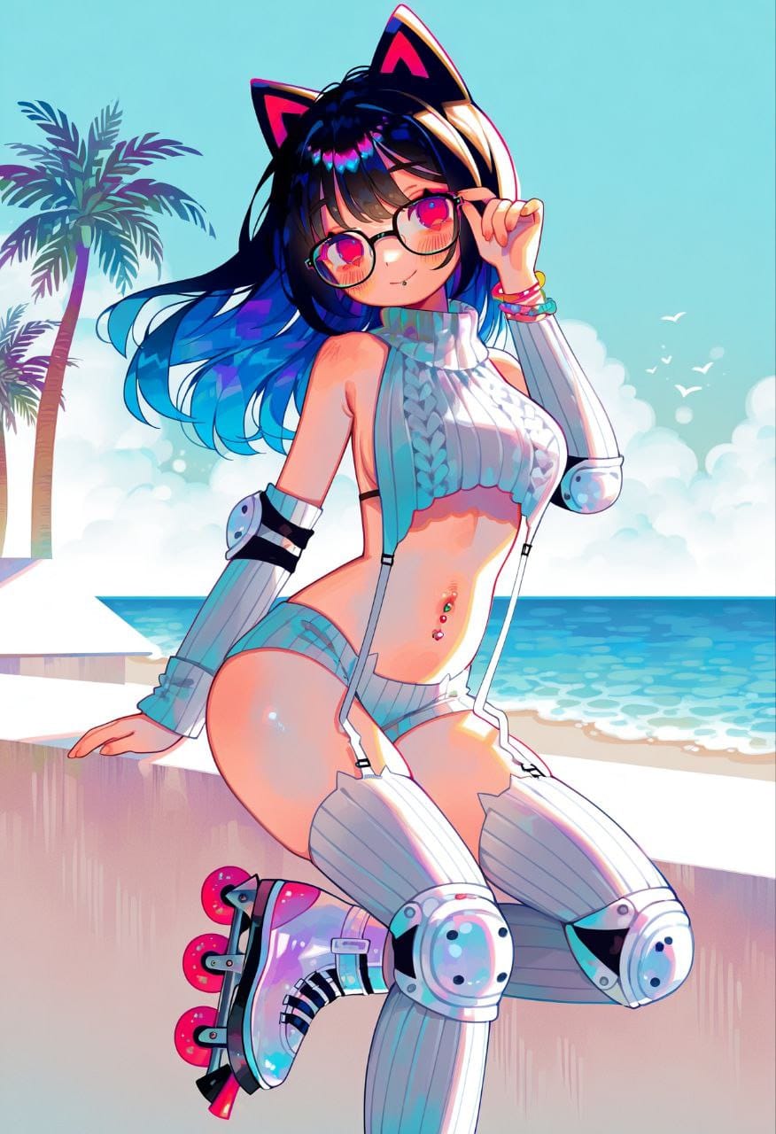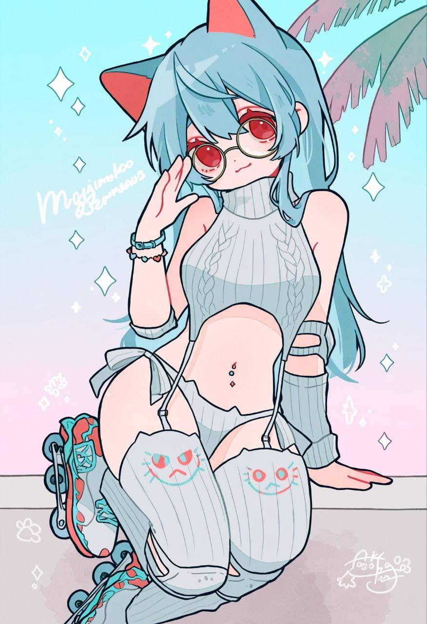 cat shorts, cropped sweater, garter straps, grey shorts, grey sweater, midriff, navel, sleeveless, elbow pads, inline skates, knee pads, roller skates, animal ear legwear, cat ear legwear, turtleneck, virgin destroyer sweater